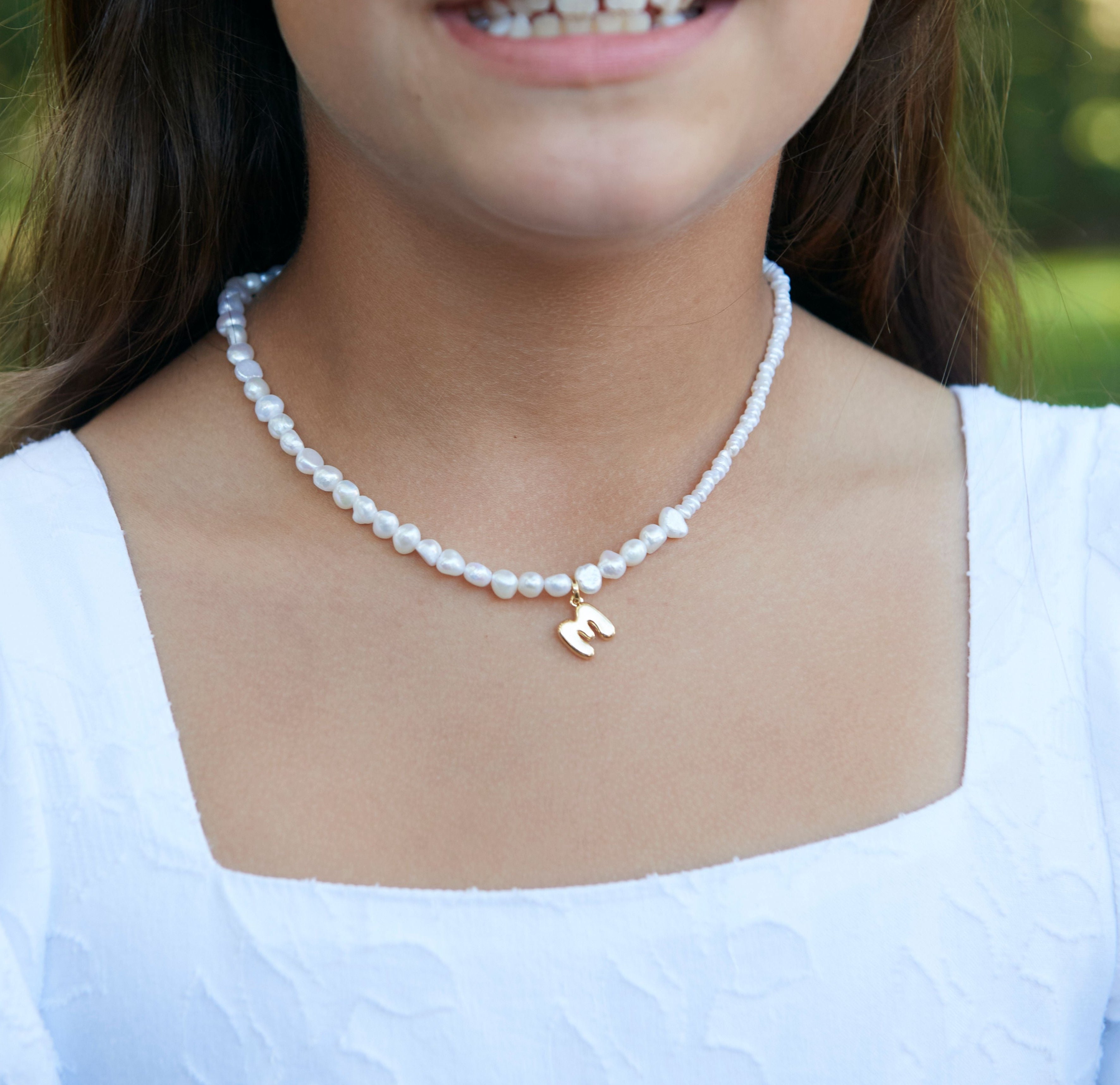 Break free from the ordinary with our Asymmetrical Pearl Beaded Bubble Initial Necklace for girls. This whimsical piece turns tradition on its head, blending timeless pearls with a bold, offbeat twist.