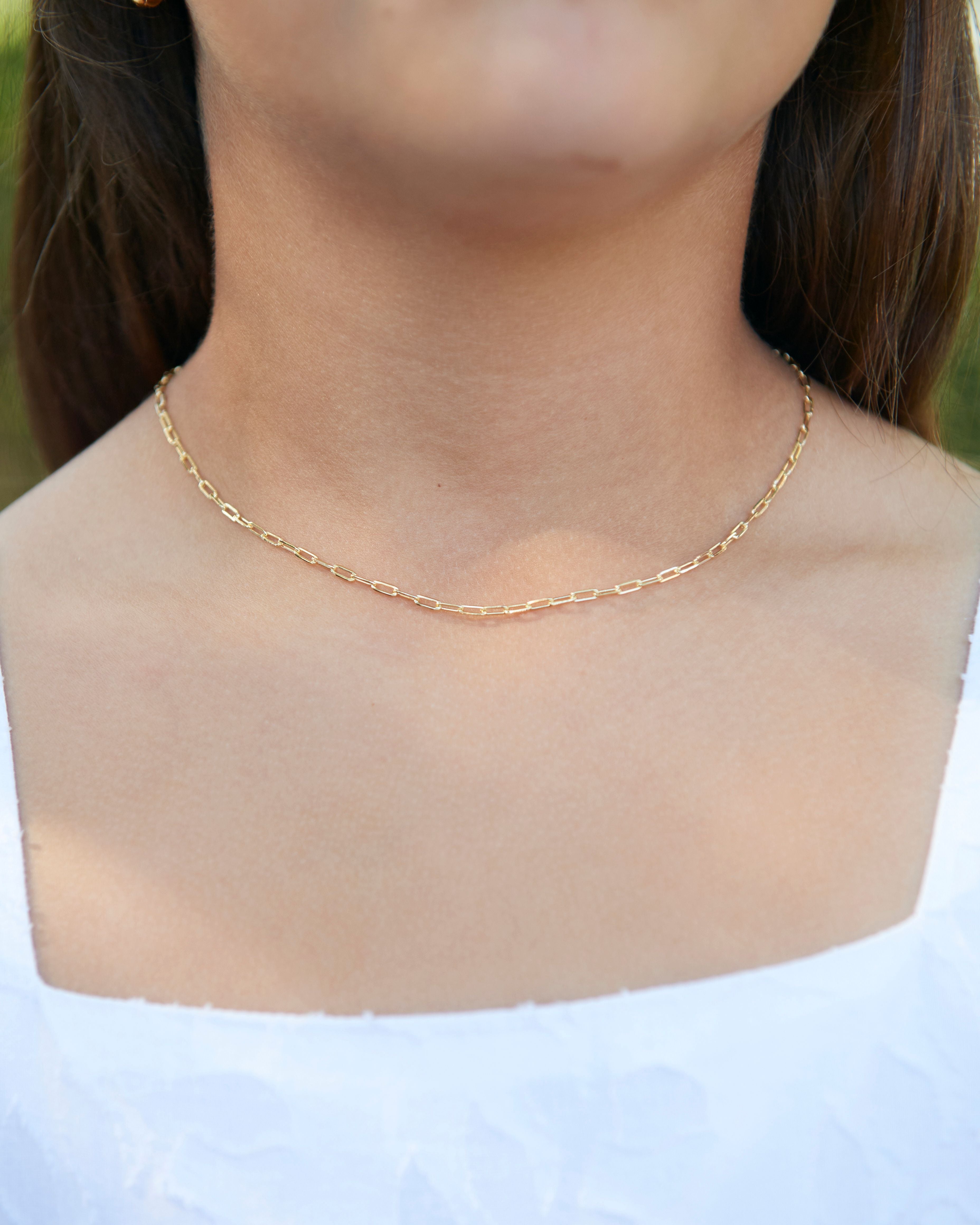 Mali Beads' Ayla Paperclip Necklace is sleek, simple, and on trend. It brings effortless style to your little girl's jewelry collection. With its bold yet lightweight links, it’s a fresh twist on a classic that girls love to wear every day.