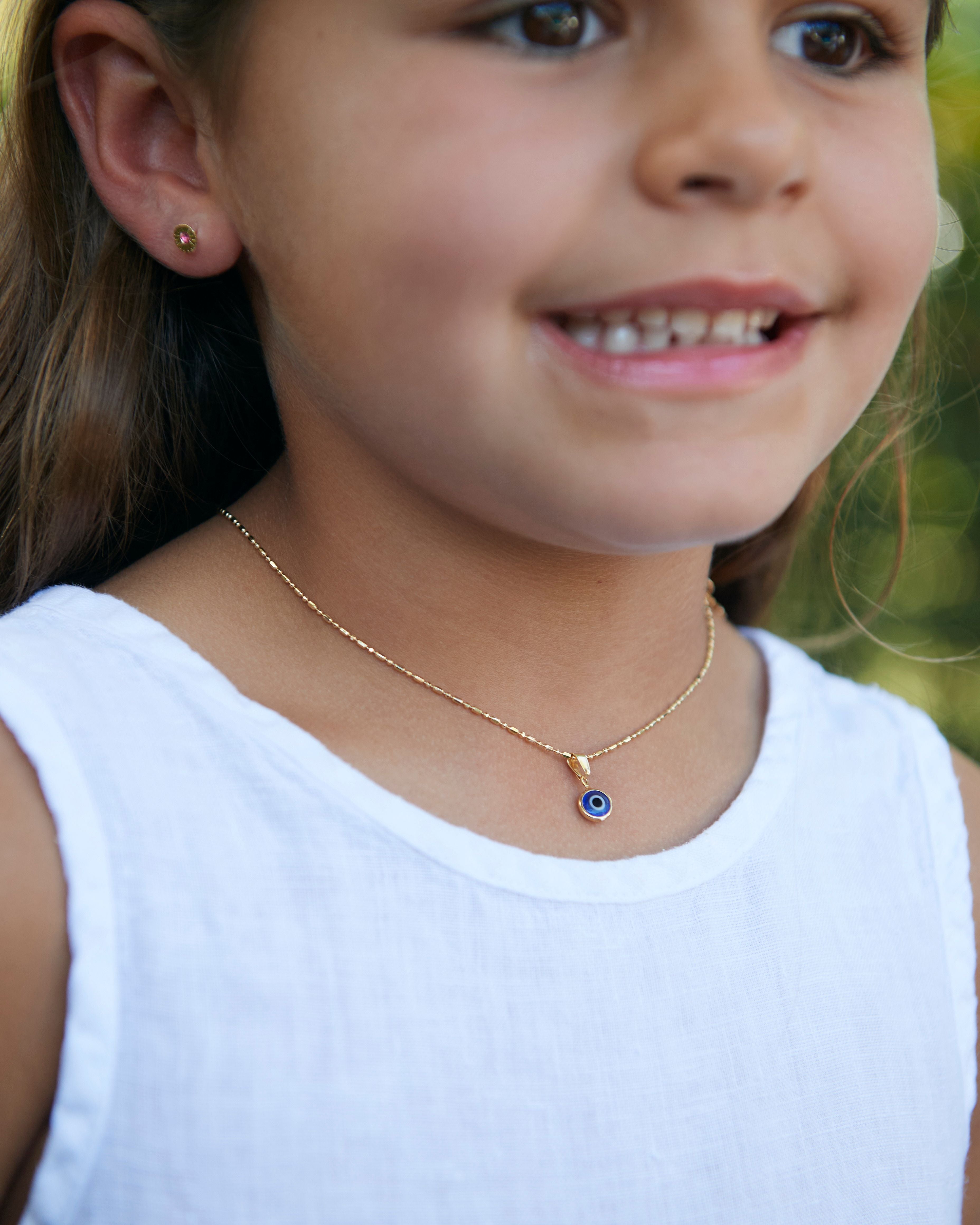 Our gold-filled Bellamy Evil Eye Necklace for girls is a modern symbol of protection and positivity. It is designed to keep her surrounded by good energy and timeless style. Delicate and meaningful, it’s the perfect piece to wear close every day.