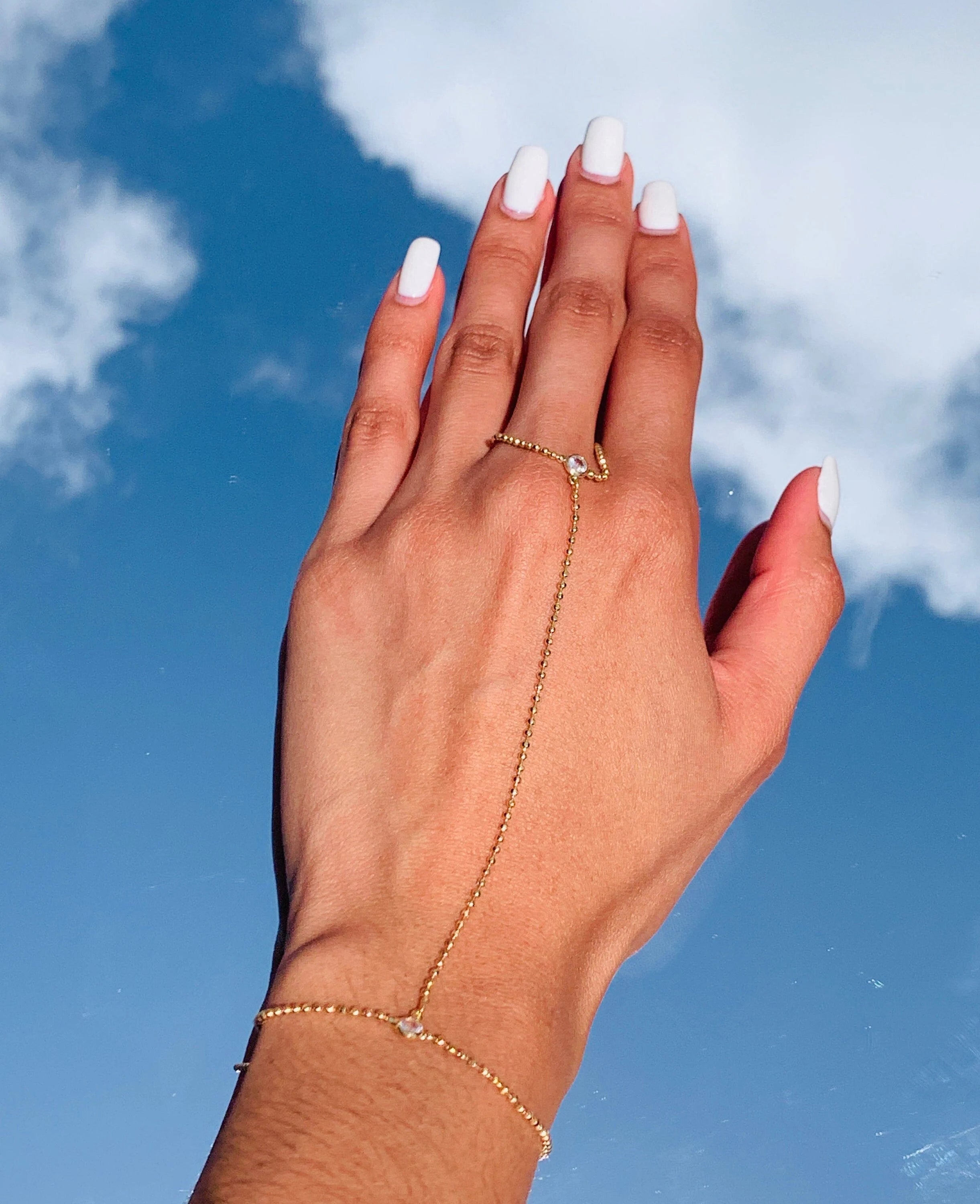 Make a statement with our Gold-Filled Celi CZ Ball Hand Chain Bracelet, a sleek and sophisticated piece that effortlessly enhances any look.