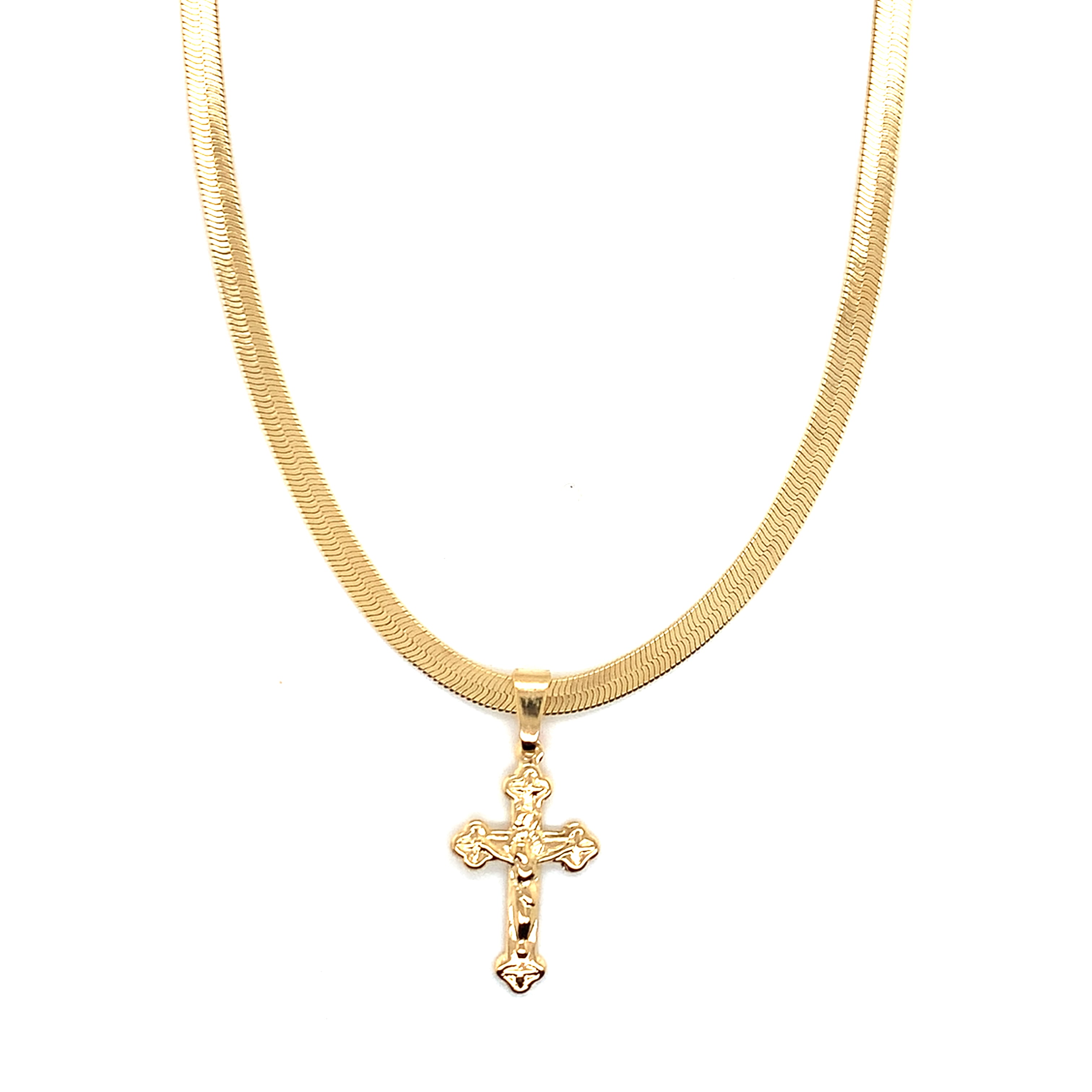 A beautiful fusion of faith and fashion, this necklace pairs the sleek elegance of a gold-filled herringbone chain with a delicate cross pendant, creating a timeless and meaningful accessory.