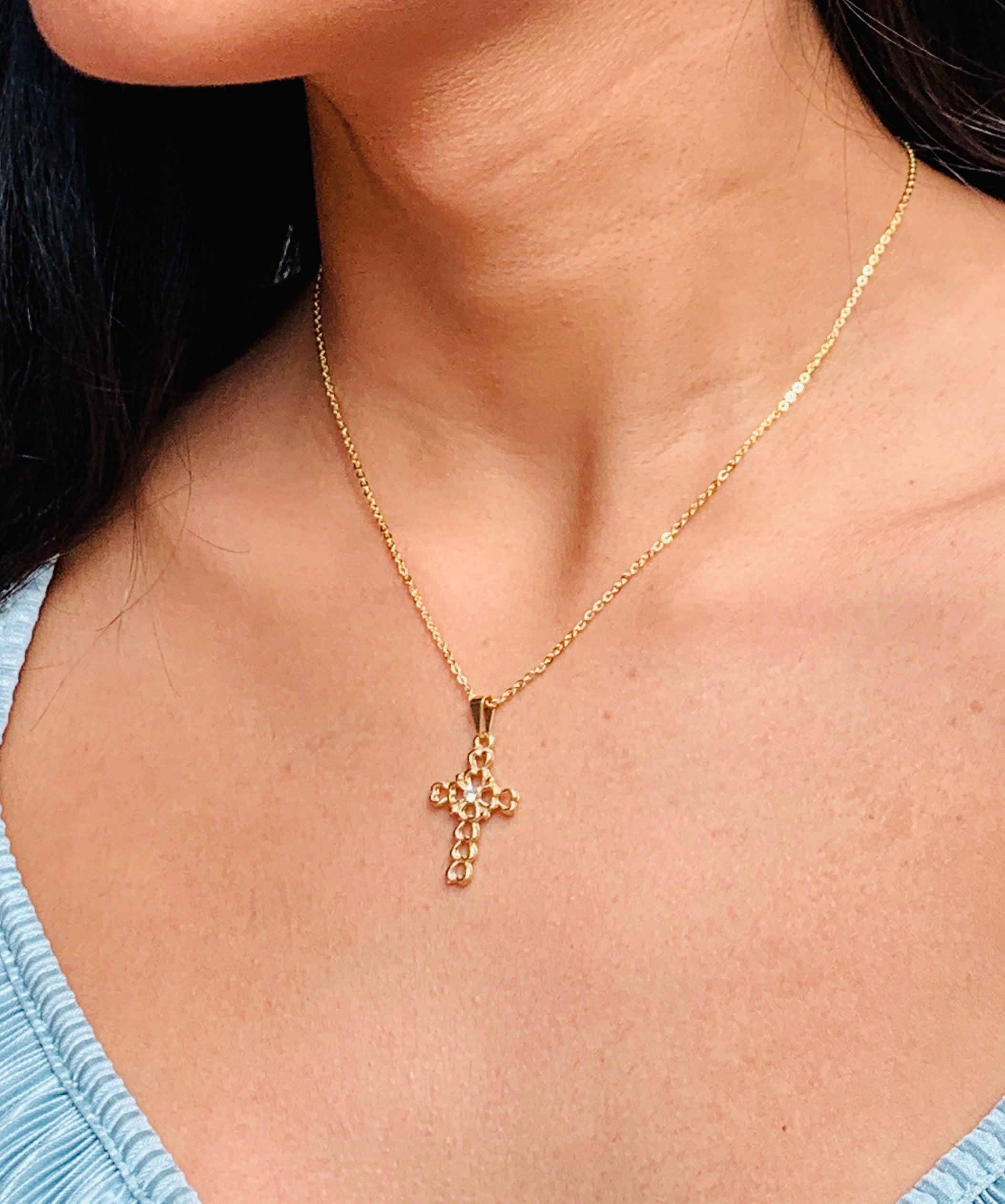 Our Gold-Filled Cross Necklace features a dazzling cross pendant adorned with high-quality CZ stones, renowned for their brilliant sparkle and durability. Designed for both everyday elegance and special occasions, this versatile piece effortlessly complements any outfit, from casual to formal.
