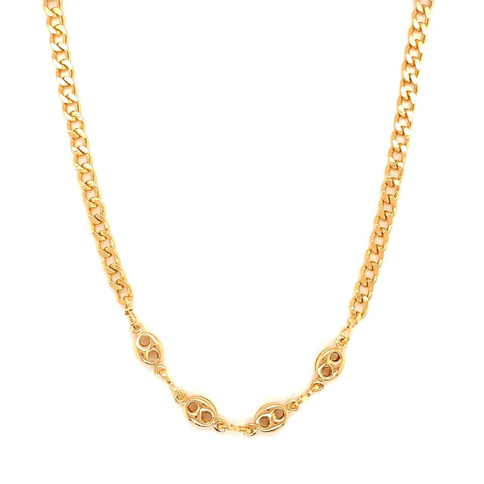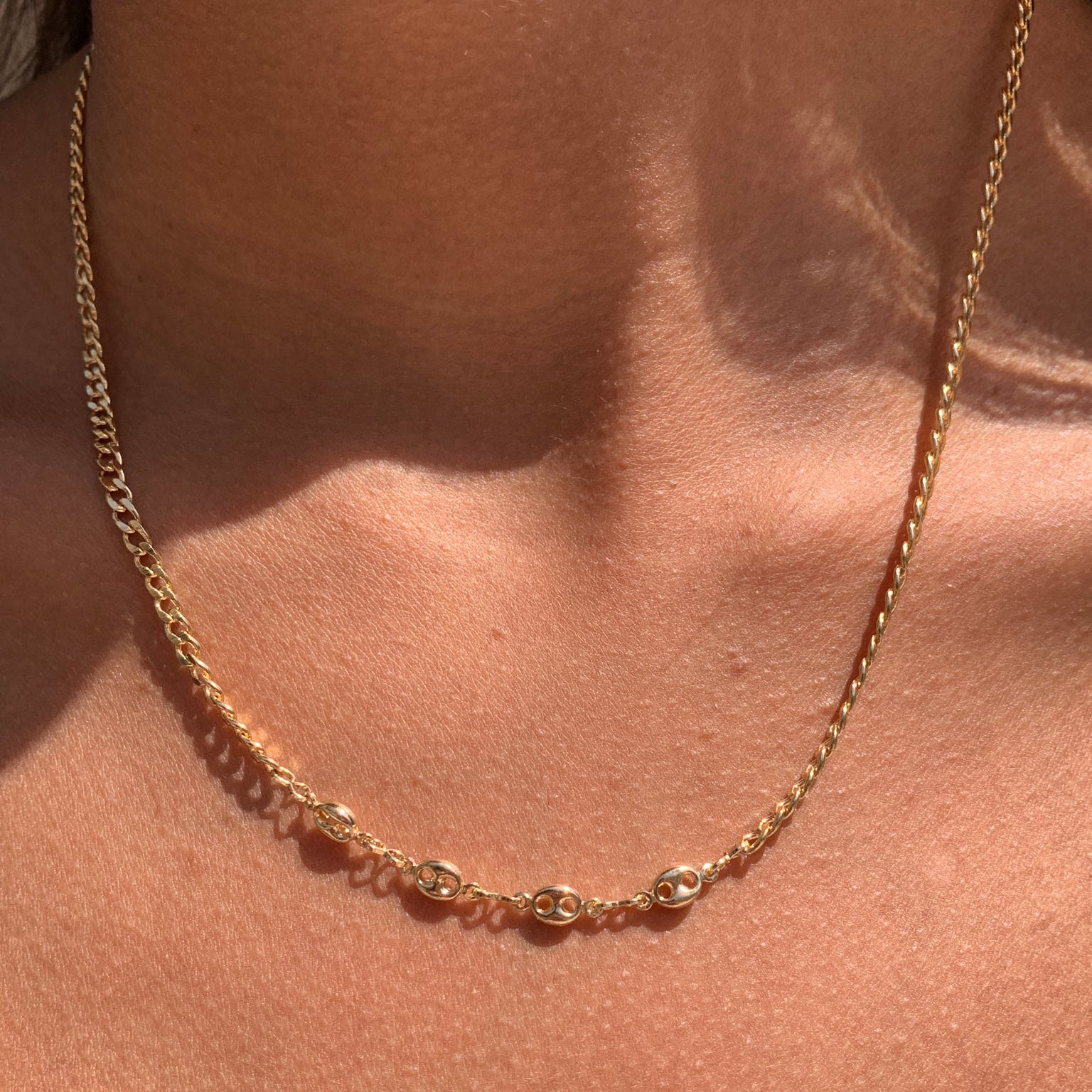 A classic curb chain with mariner puff center. The perfect mash up of two of our favorite Gold Filled chains.
