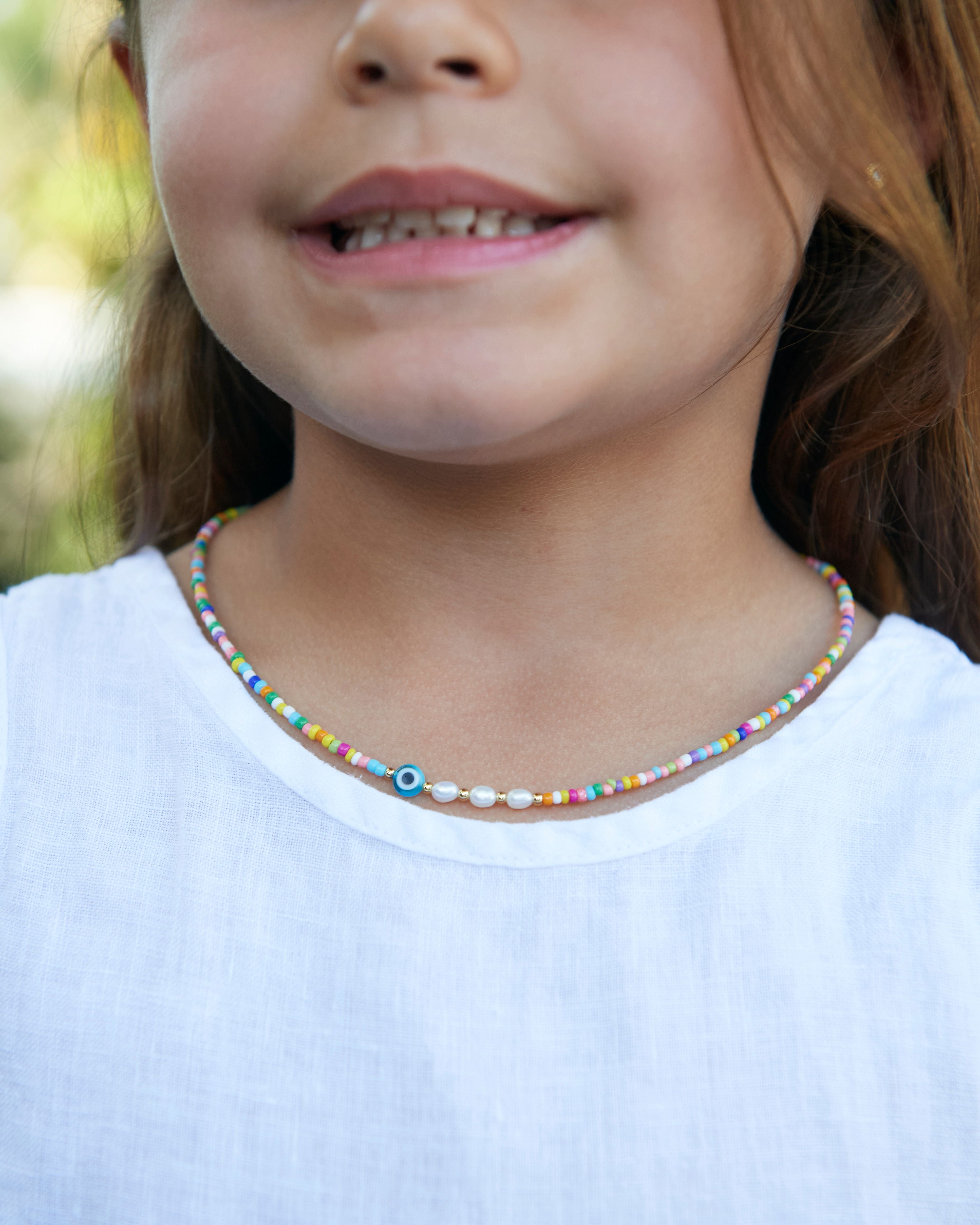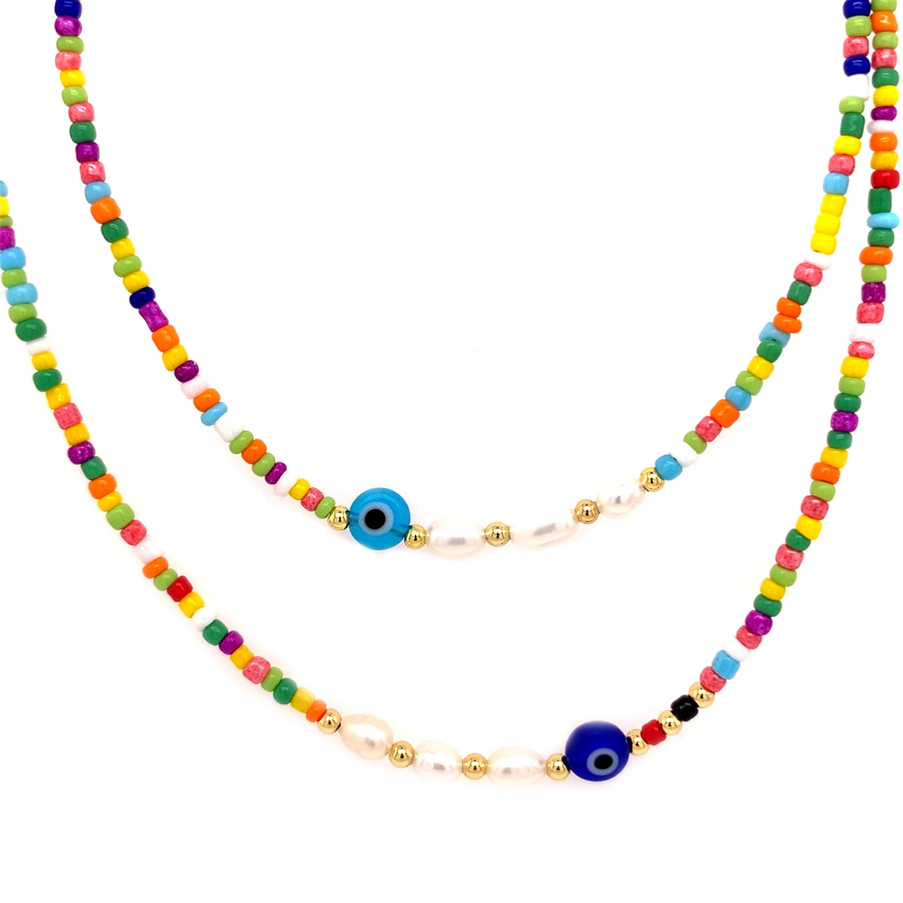 Featuring a unique evil eye bead paired with dainty faux pearls and a burst of colorful beads, this necklace is designed to add sparkle, positive energy, and a touch of fun.