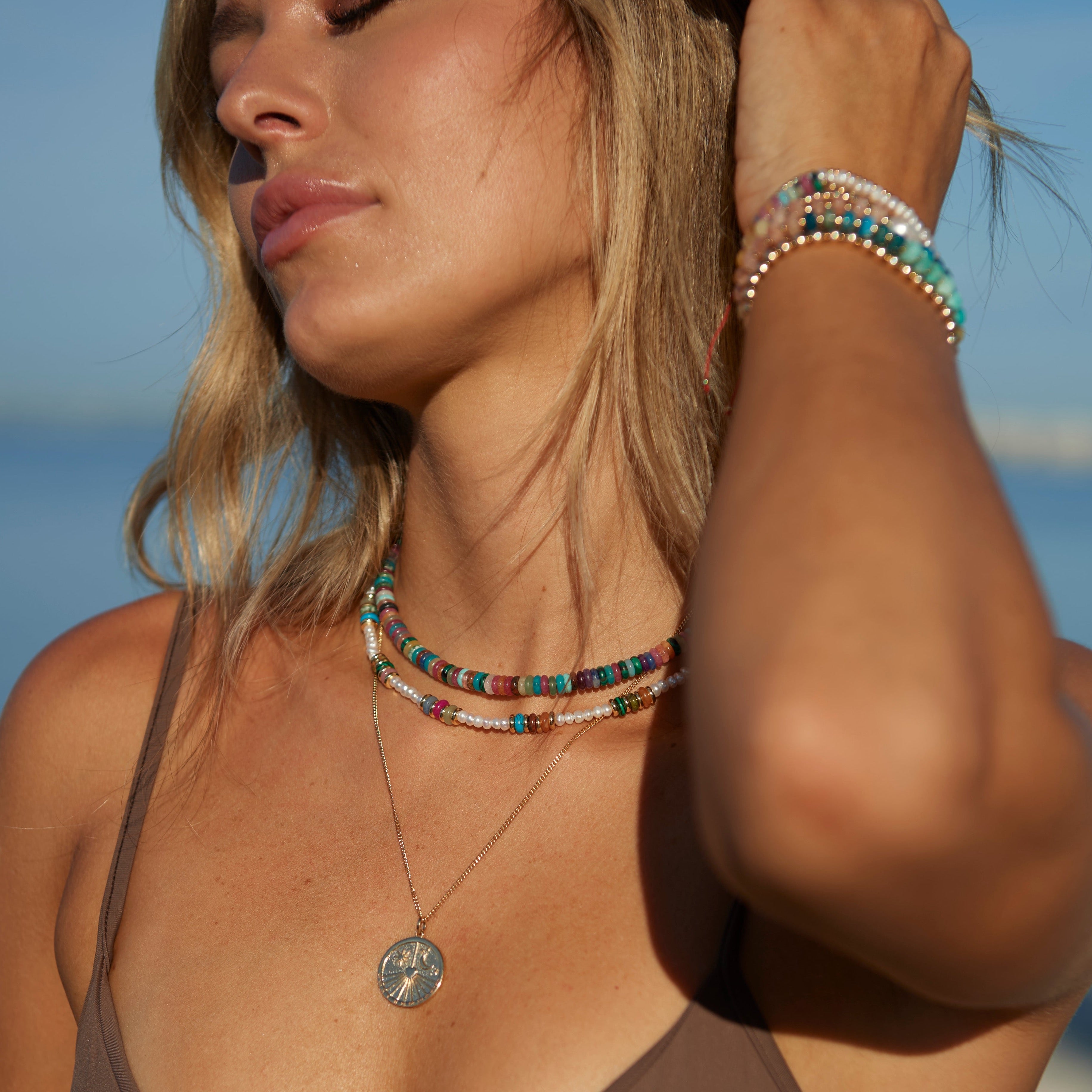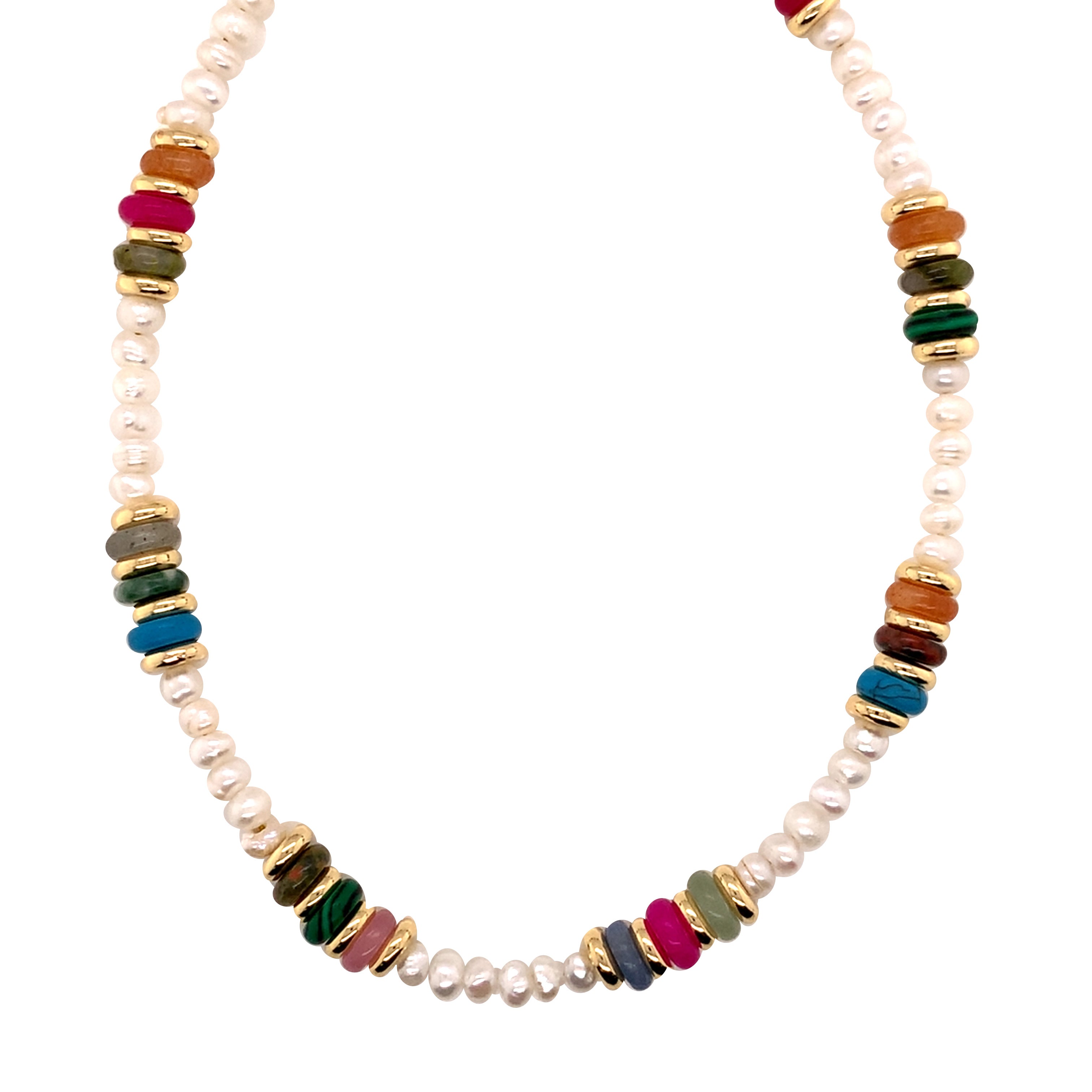 This Emi Gemstone Necklace doesn’t just accessorize—it energizes. A vibrant mix of natural gemstones and luminous freshwater pearls, the Radiant Necklace brings color, texture, and intention to your everyday style. Whether you're dressing for ease or edge, it adds just the right balance of statement and subtlety.