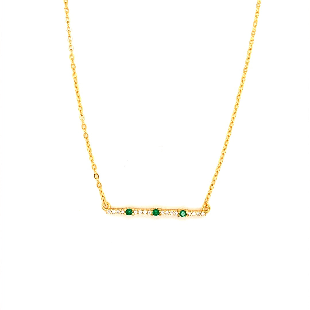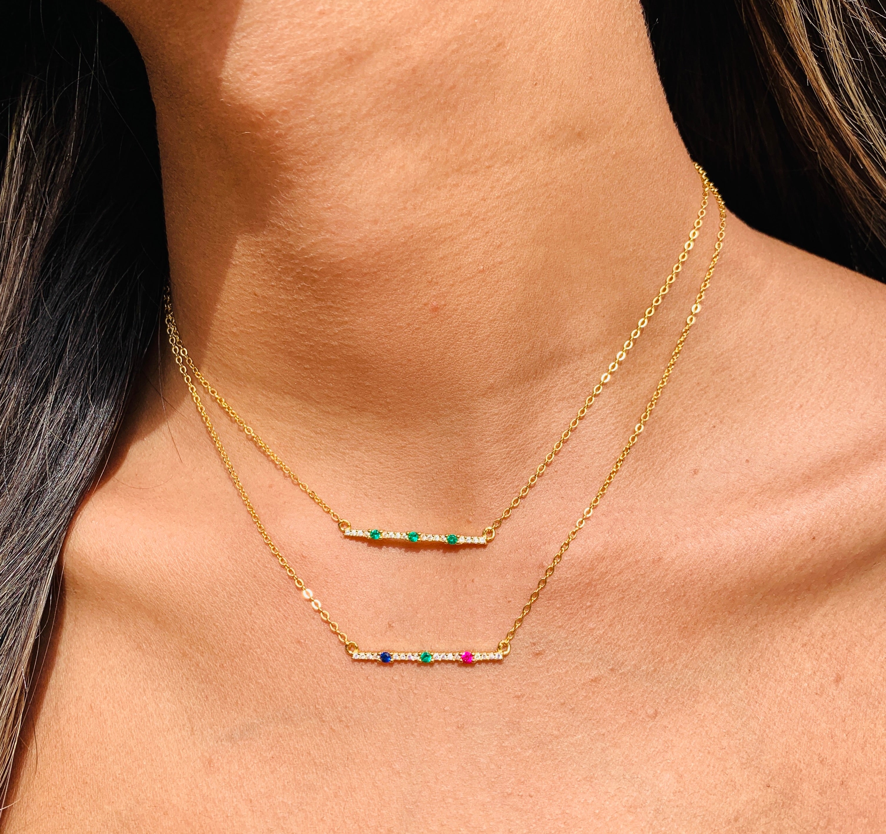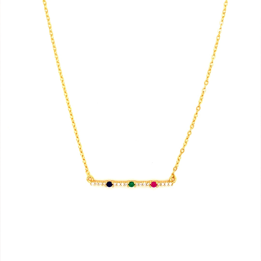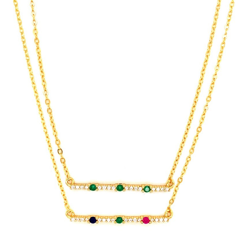 Our dainty CZ Emerald or Tricolor Bar Necklace is a stunning piece that exudes timeless elegance and versatility. The vermeil necklace features a delicate bar pendant adorned with sparkling cubic zirconia stones, available in either emerald green or ruby, navy, and emerald.