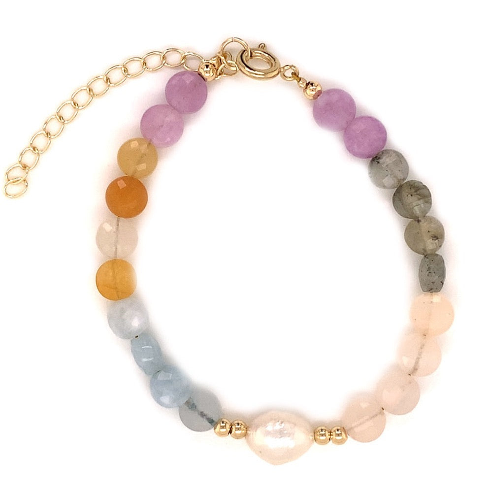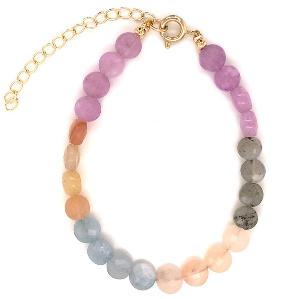 Gemstones in Bracelet: Pink Aventurine, Labradorite, Yellow Jade, Purple Amethyst, Aquamarine.