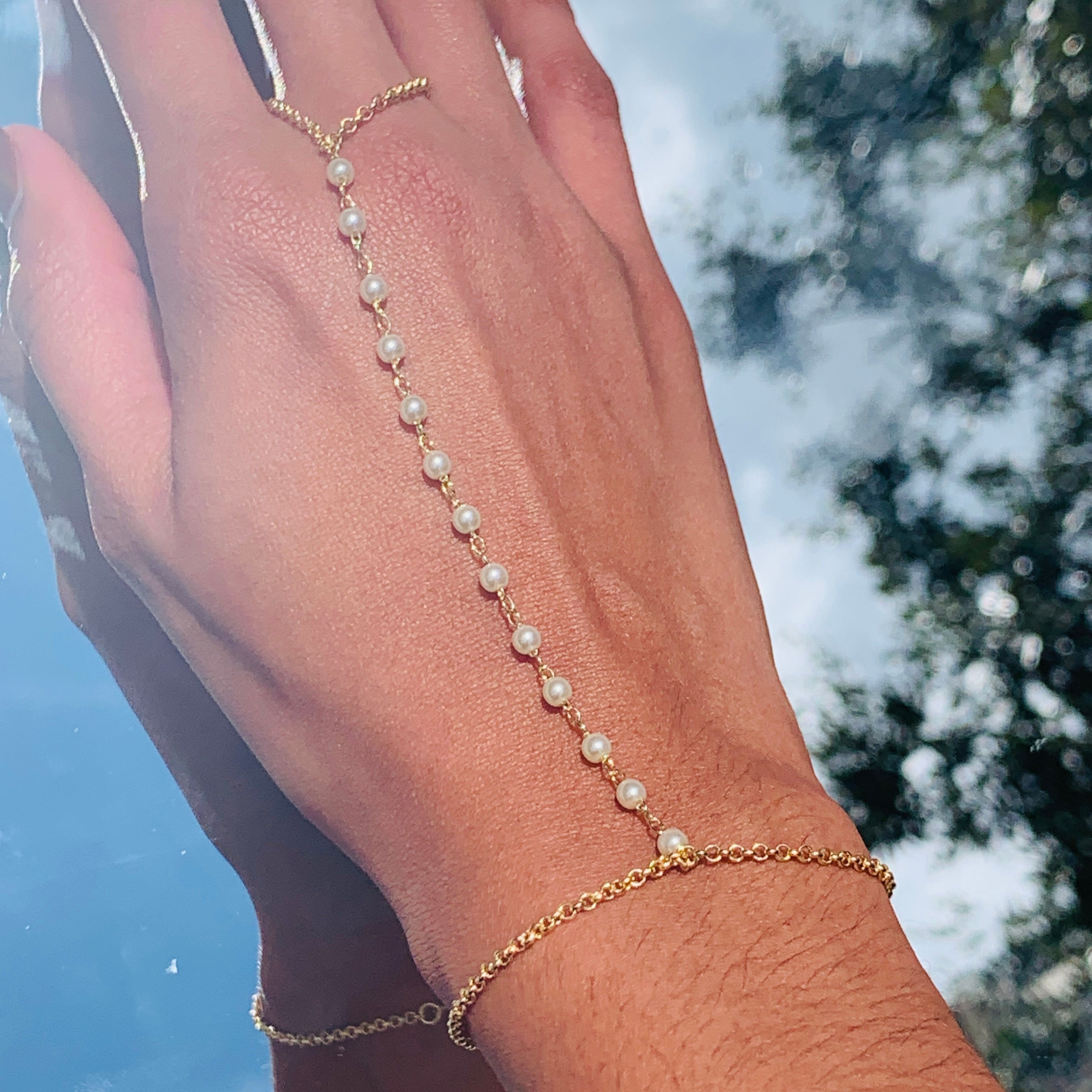 Make a statement with our Hana Pearl Hand Chain Bracelet, a sleek and sophisticated piece that effortlessly enhances any look.