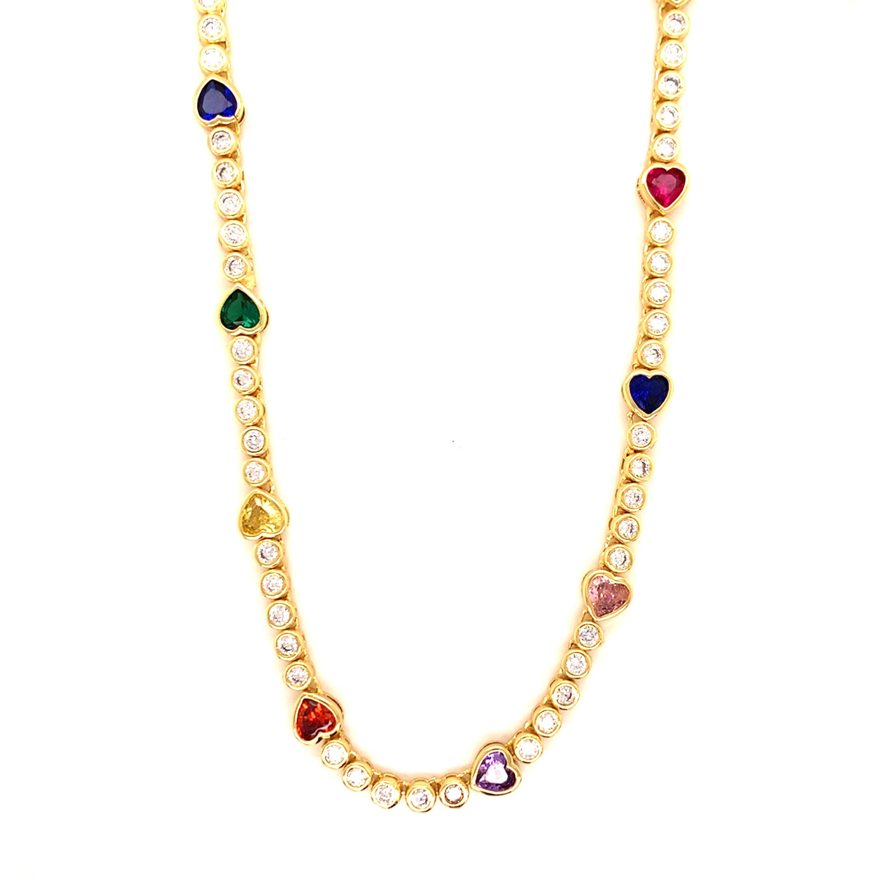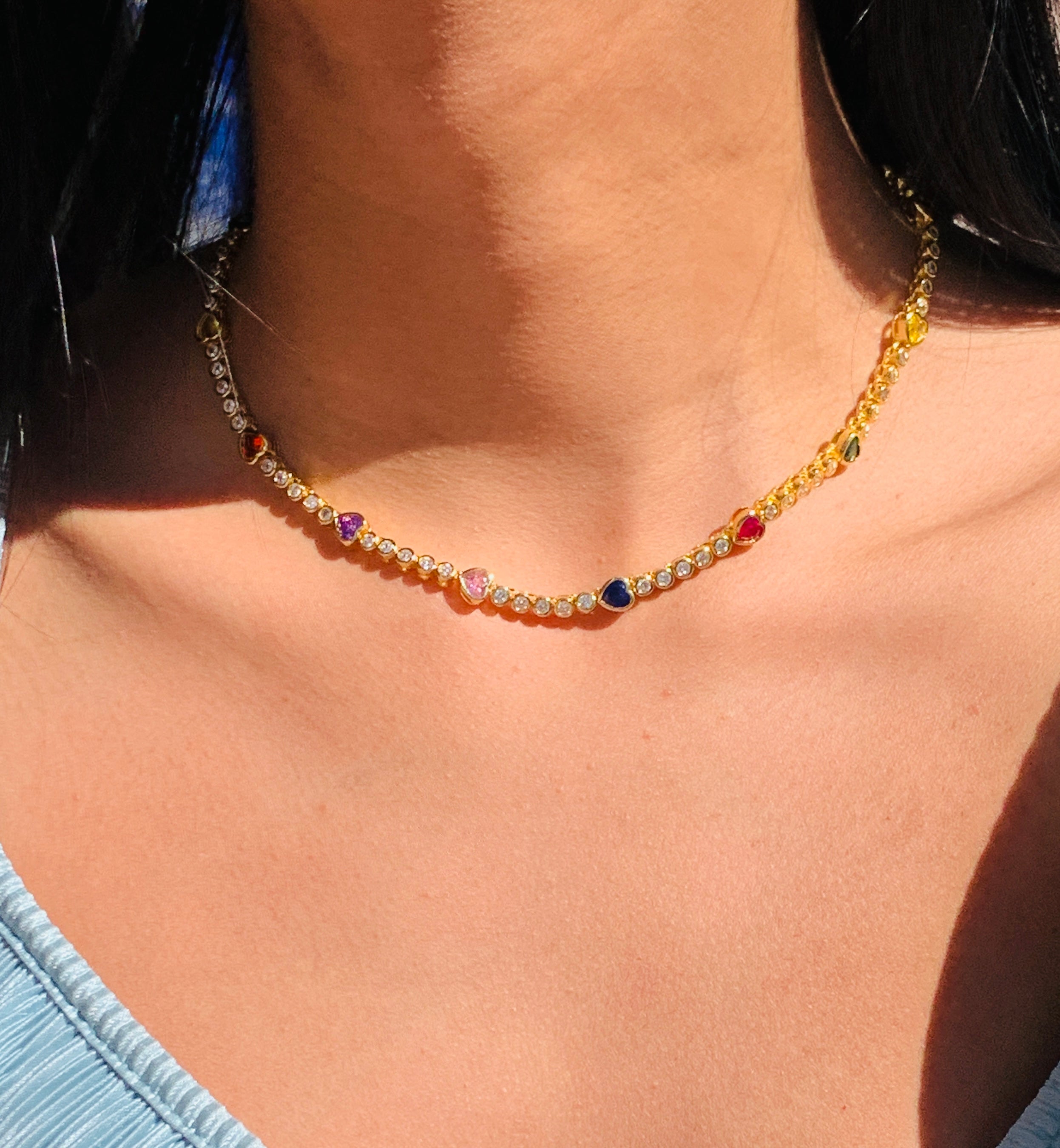 Our Tennis Necklace is a stunning fusion of elegance and personality, featuring a sleek row of dazzling CZ stones accented with vibrant multicolor hearts. The perfect balance of classic sophistication and playful charm, this piece catches the light and attention wherever you go.