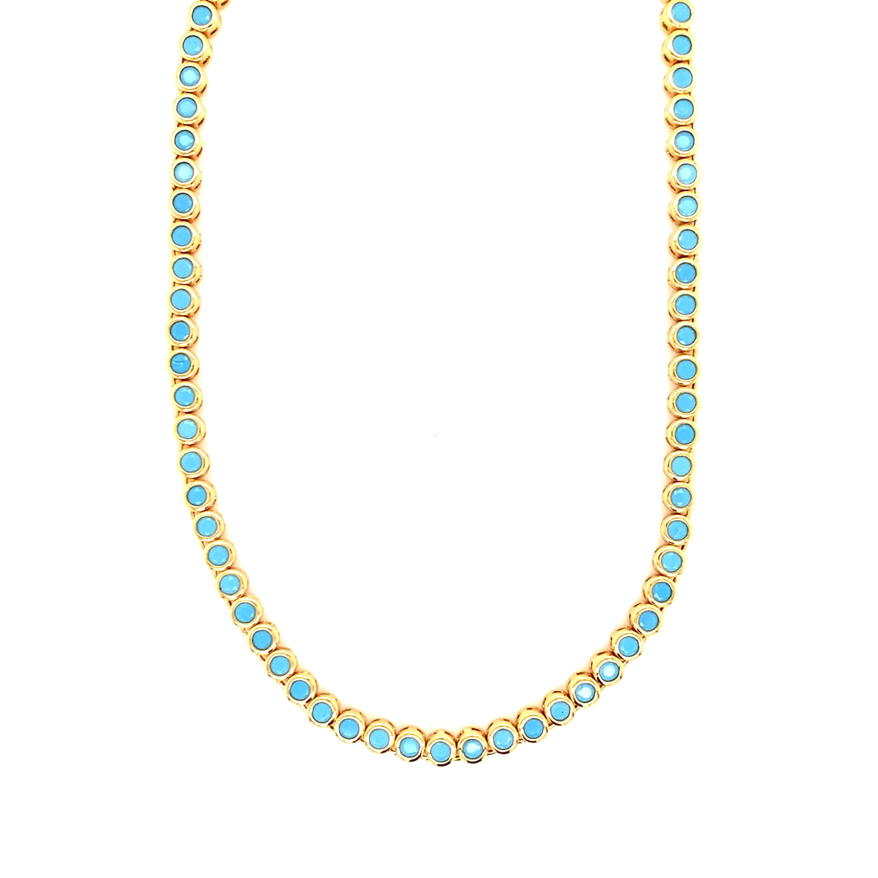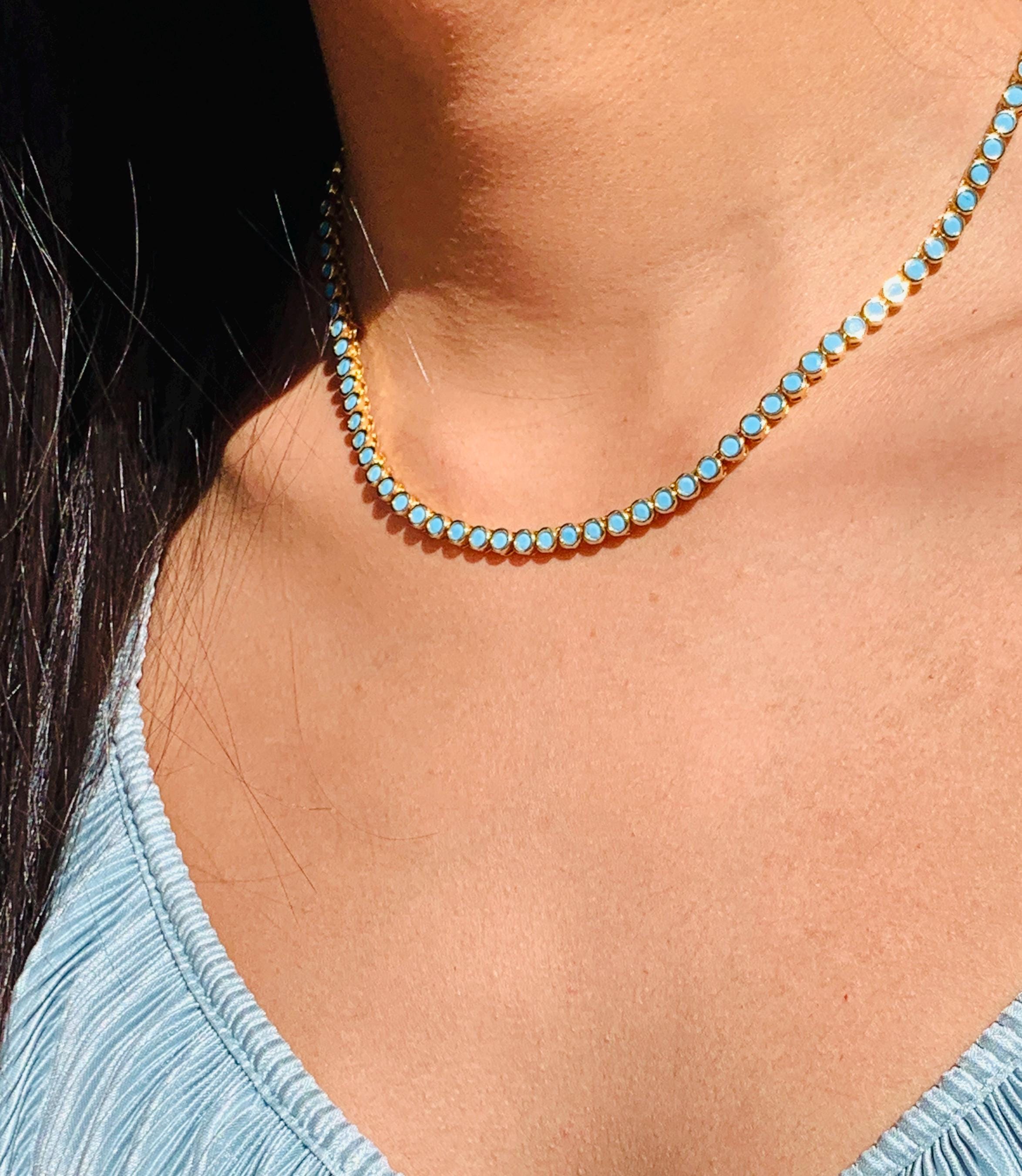Our Teal Gemstone Tennis Necklace is a true showstopper, featuring a continuous row of vibrant, shimmering teal gemstones that catch the light with every movement. Whether you're dressing up for a special occasion or adding a touch of luxury to your everyday look, this timeless piece brings effortless sophistication and charm to any outfit.