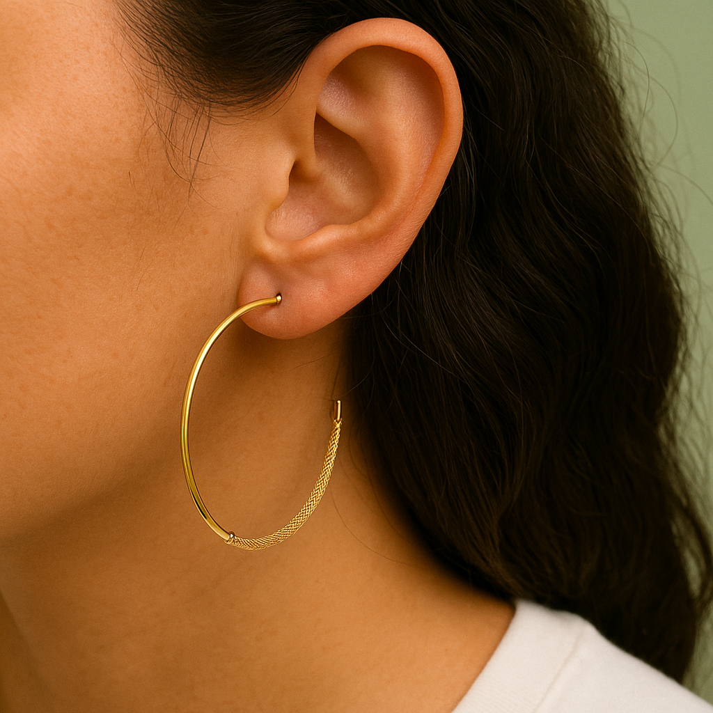 Great quality gold hoops. Very nice color Gold with sparkle. I love my gold hoops.