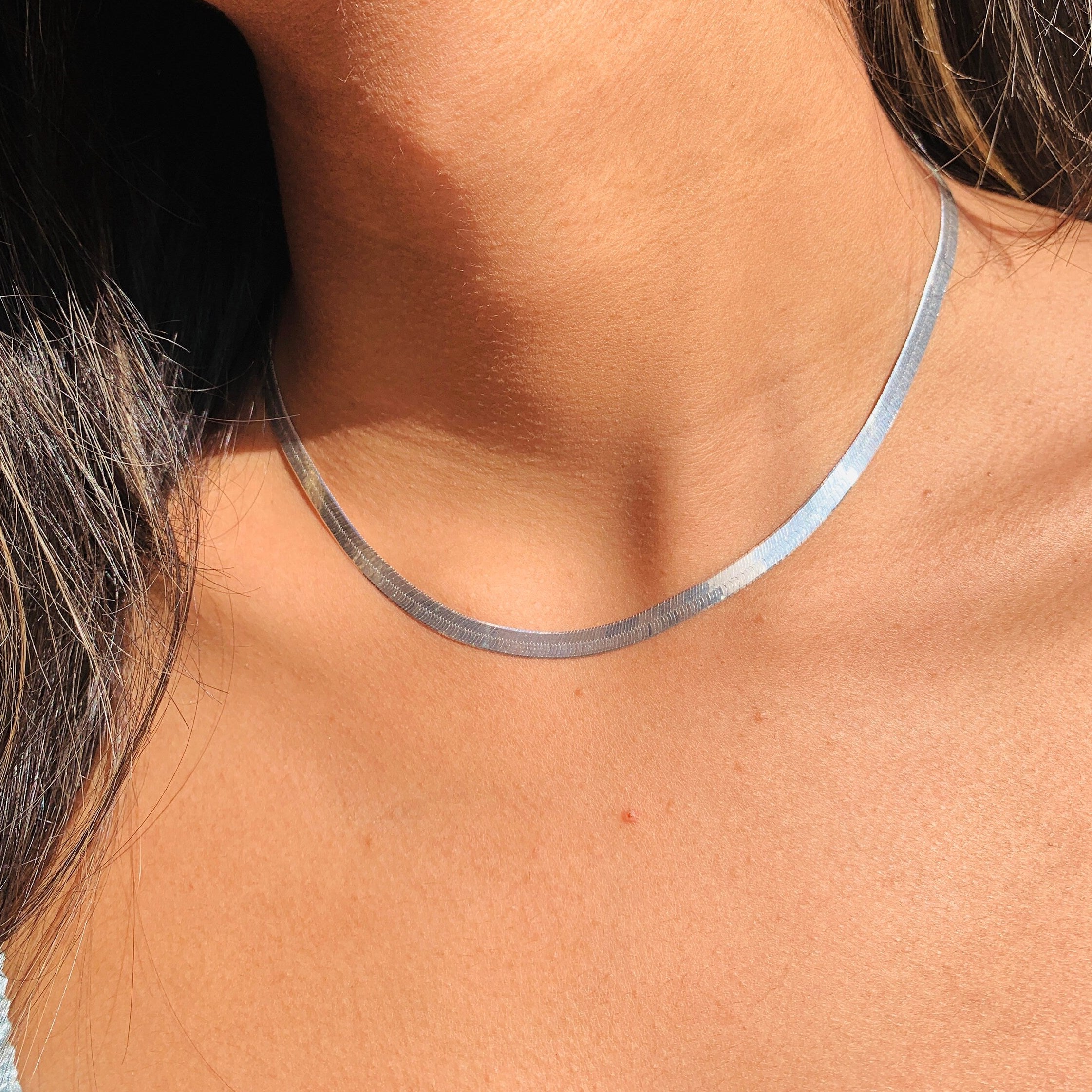 Introducing our Sterling Silver Herringbone Necklace, a classic statement of elegance with a fluid, mirror-like shine. Designed with a sleek, flat-laying herringbone pattern, this piece drapes beautifully against your neckline, reflecting light with every movement. Whether worn alone for a chic, minimalist look or layered for added depth, its versatile design makes it an essential addition to any jewelry collection.