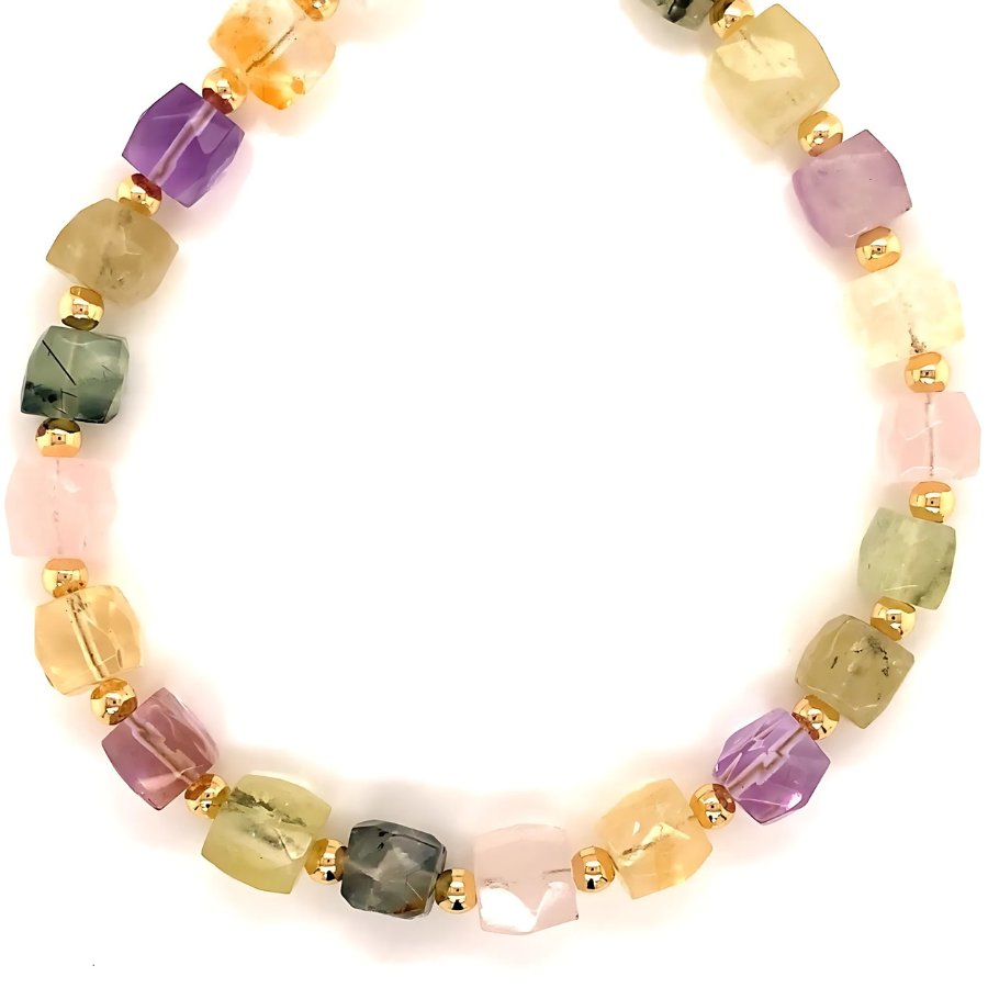 The mesmerizing combination of rose quartz, amethyst, citrine, and flourite creates a captivating symphony of colors that will instantly elevate any ensemble. Whether you're dressing up for a special occasion or adding a touch of glamour to your everyday look, this natural gemstone necklace is sure to turn heads and spark conversations.