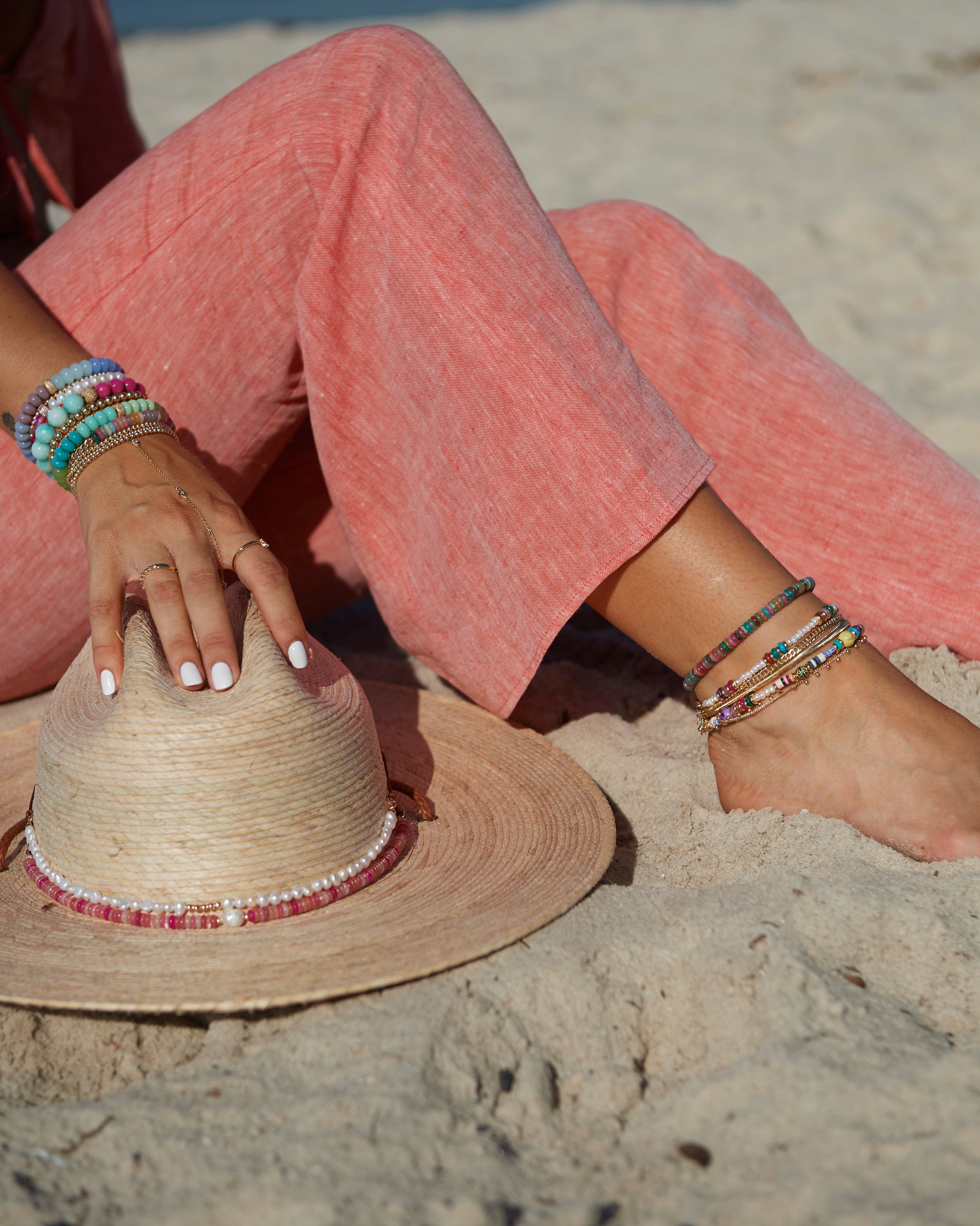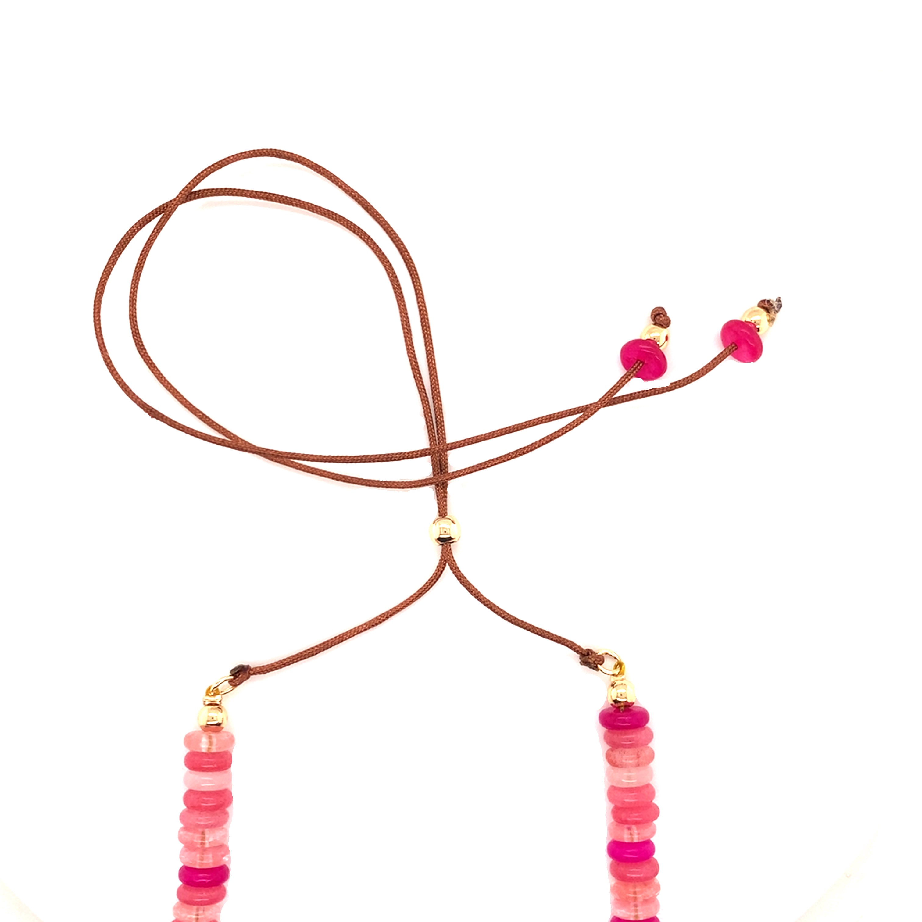 The Monaco ombre pink Hat Band serves as the ultimate accessory, effortlessly transitioning from a chic hat band to a stylish necklace. It offers the freedom to express your unique style in multiple ways. Whether you're dressing up your favorite sunhat, adding flair to your cowgirl hat, or wearing it as a necklace.