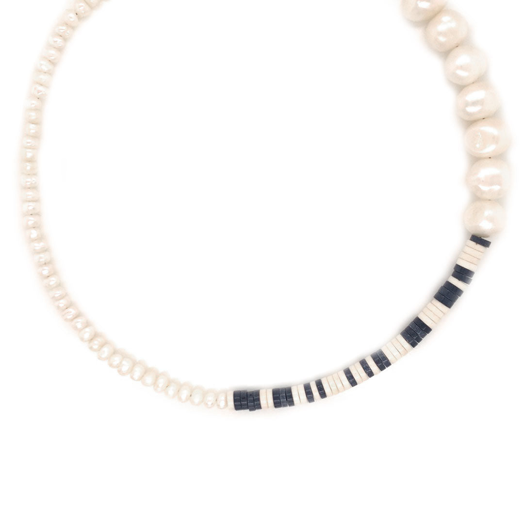 Discover the exquisite balance of timeless sophistication and free-spirited style with our Nyra Heishi Pearl Necklace. This unique piece artfully blends luminous pearls with smooth heishi beads, creating a versatile accessory that transitions effortlessly from brunch dates to evening soirées.