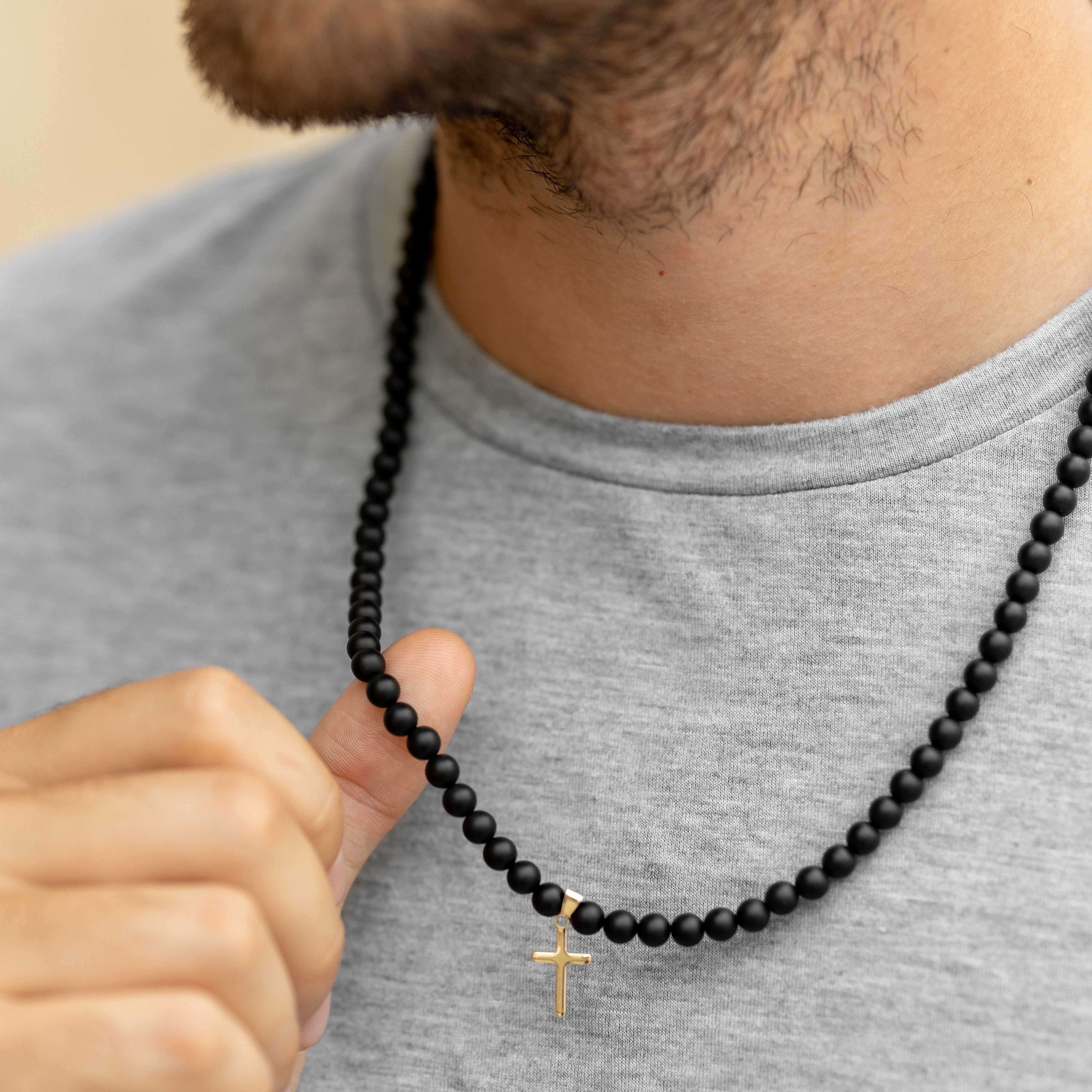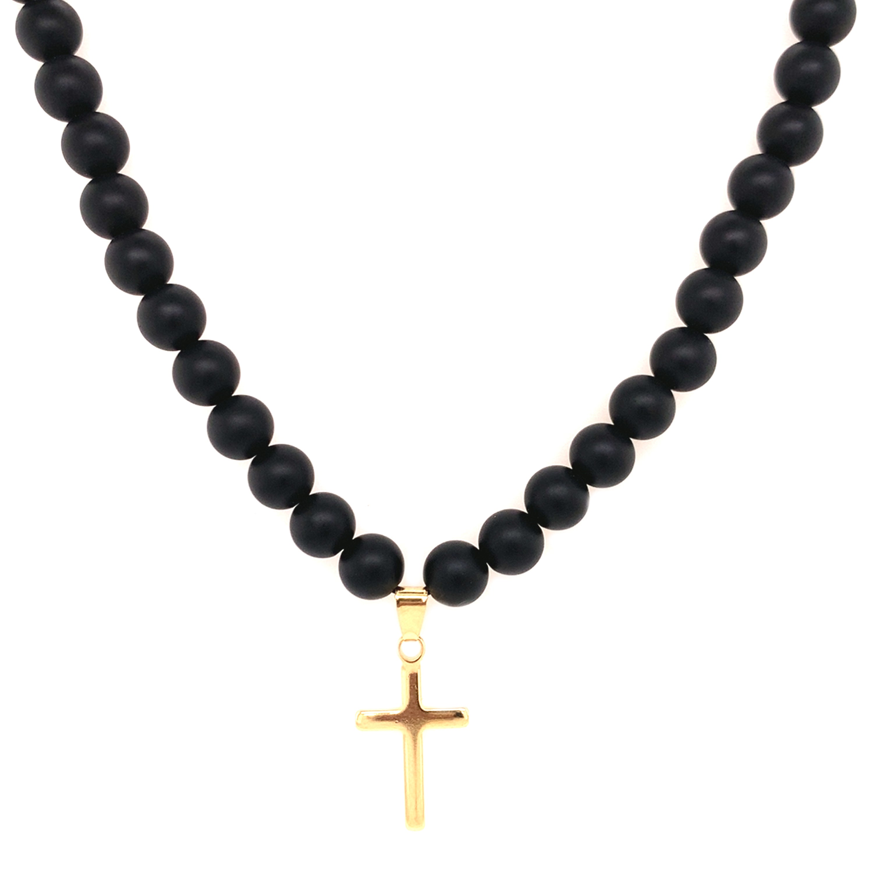 Our Matte Onyx Beaded Necklace with a Gold-Filled Cross Pendant, a captivating and meaningful piece that beautifully combines elegance with the symbolism of faith. The dark and velvety appearance of the onyx beads contrasts beautifully with the radiant shine of the gold-filled cross pendant, making it a versatile and cherished accessory that complements any outfit.