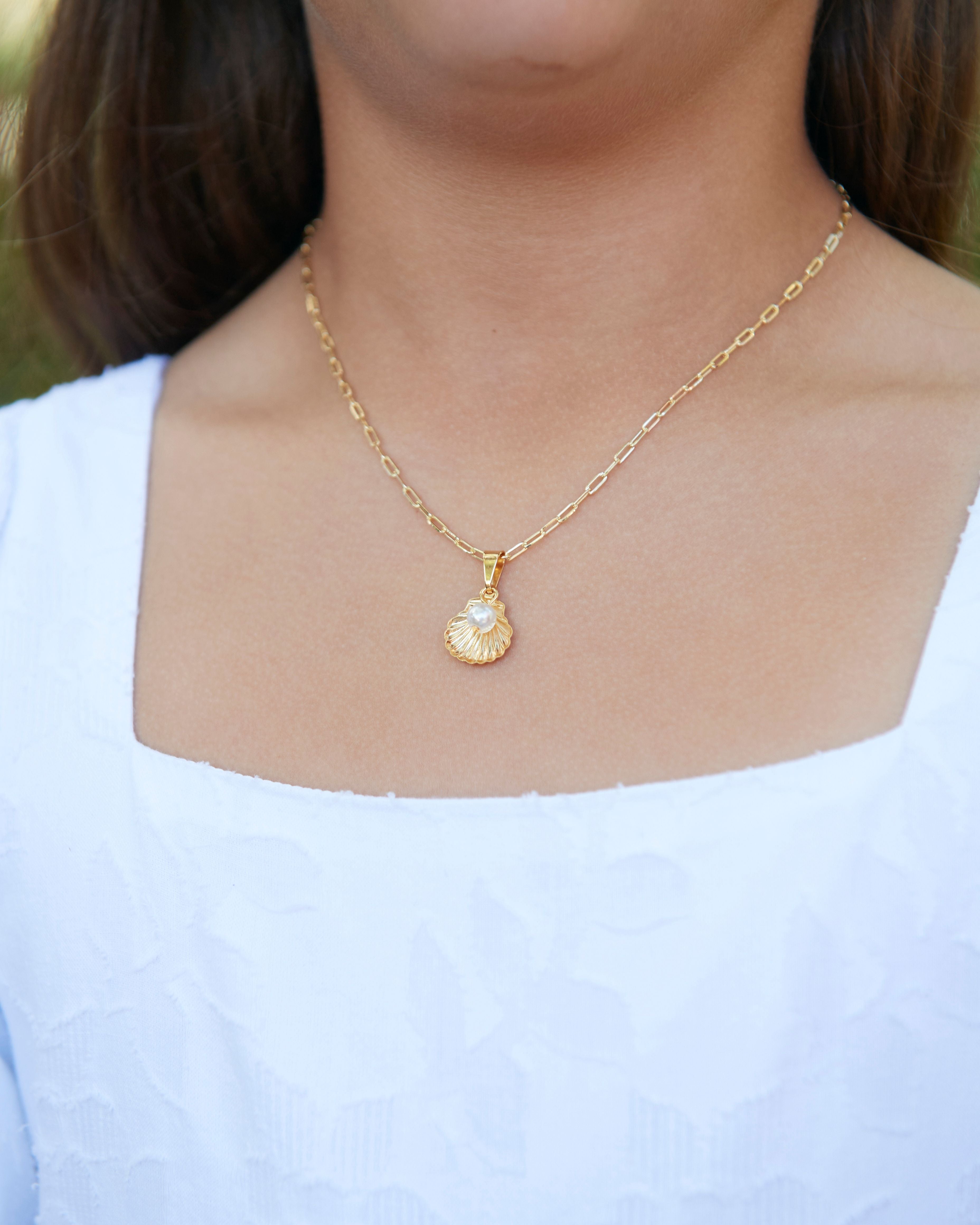 Delicate, beachy, and full of charm, this Seashell Necklace is a sweet reminder of sun-soaked days, salty air, and the joy of growing up with wonder.