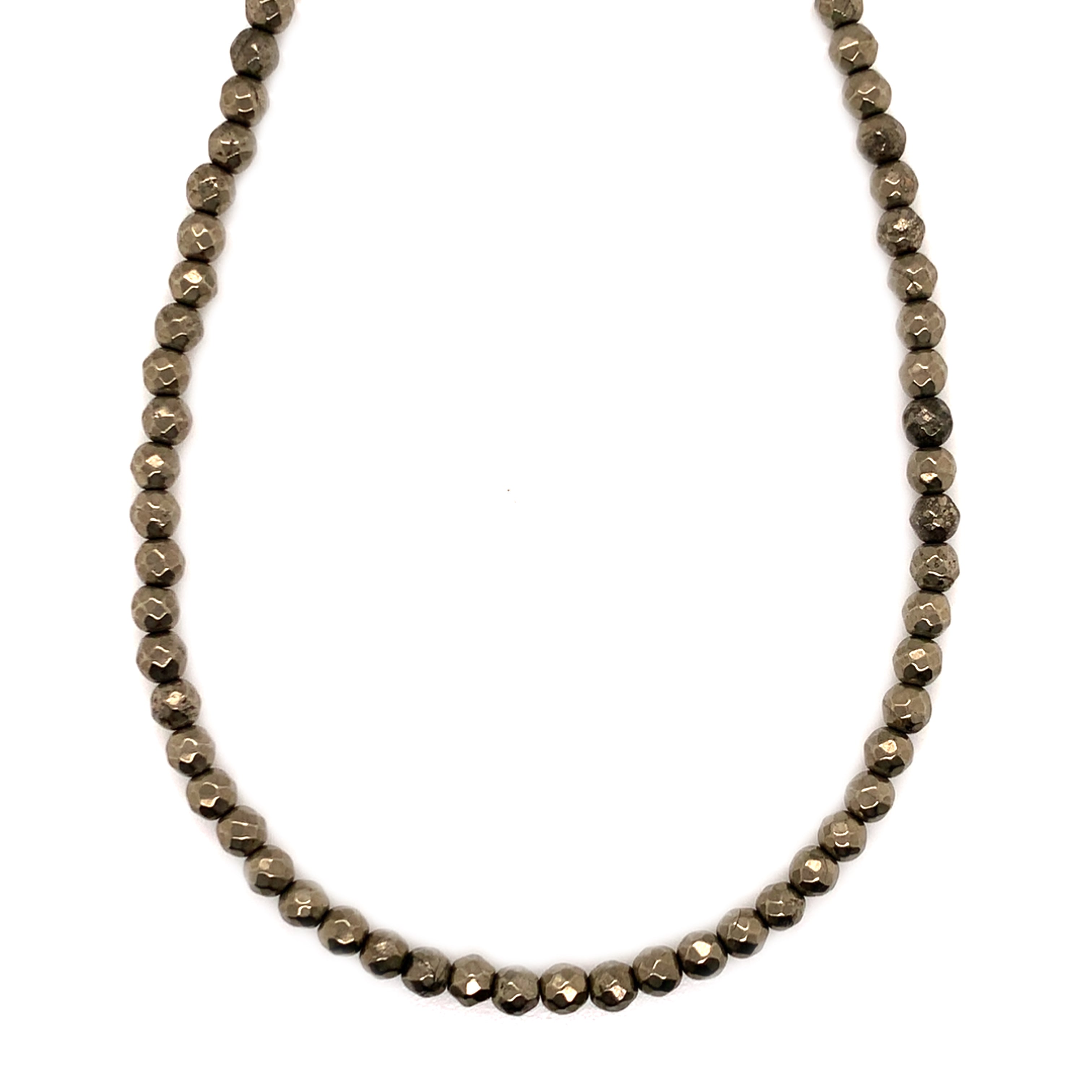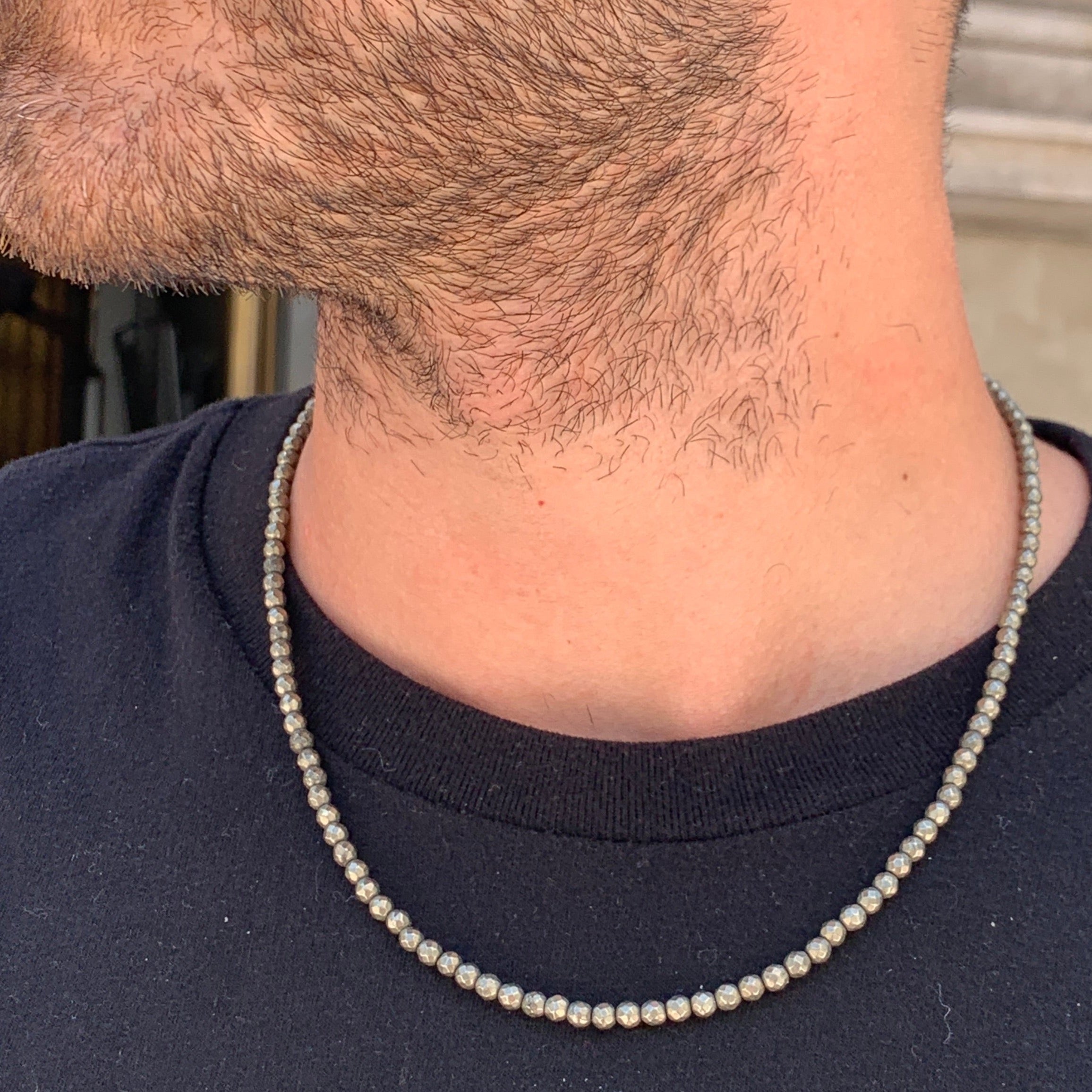 Add a distinguished touch to your accessories with our Pyrite Beaded Necklace. It is a striking accessory that blends masculinity and sophistication in perfect harmony. Meticulously crafted from genuine pyrite beads, each one exudes a rugged charm and a touch of metallic allure.