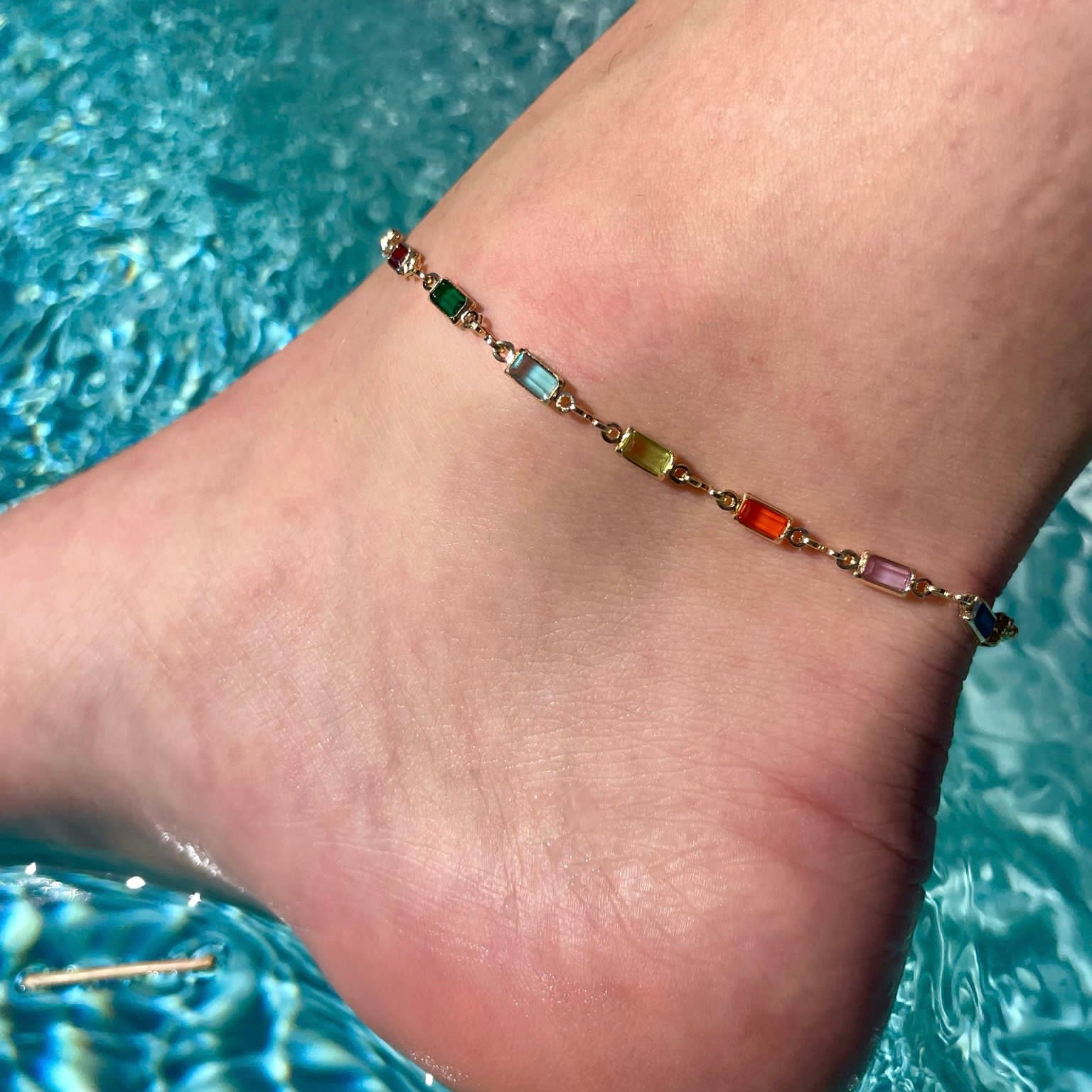 Elevate your ankle adornment with our exquisite rectangle gemstone anklet. This enchanting accessory showcases a series of oval-shaped gemstones, each radiating its own unique charm and brilliance. The carefully selected gemstones are meticulously set in a delicate chain, creating a captivating anklet that adds a touch of glamour to any ensemble. Embrace the allure of gemstones and let your ankles sparkle with our oval gemstone anklet. Shop now and indulge in the beauty of this exquisite accessory.