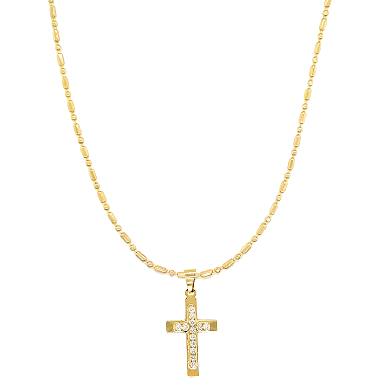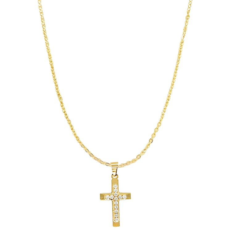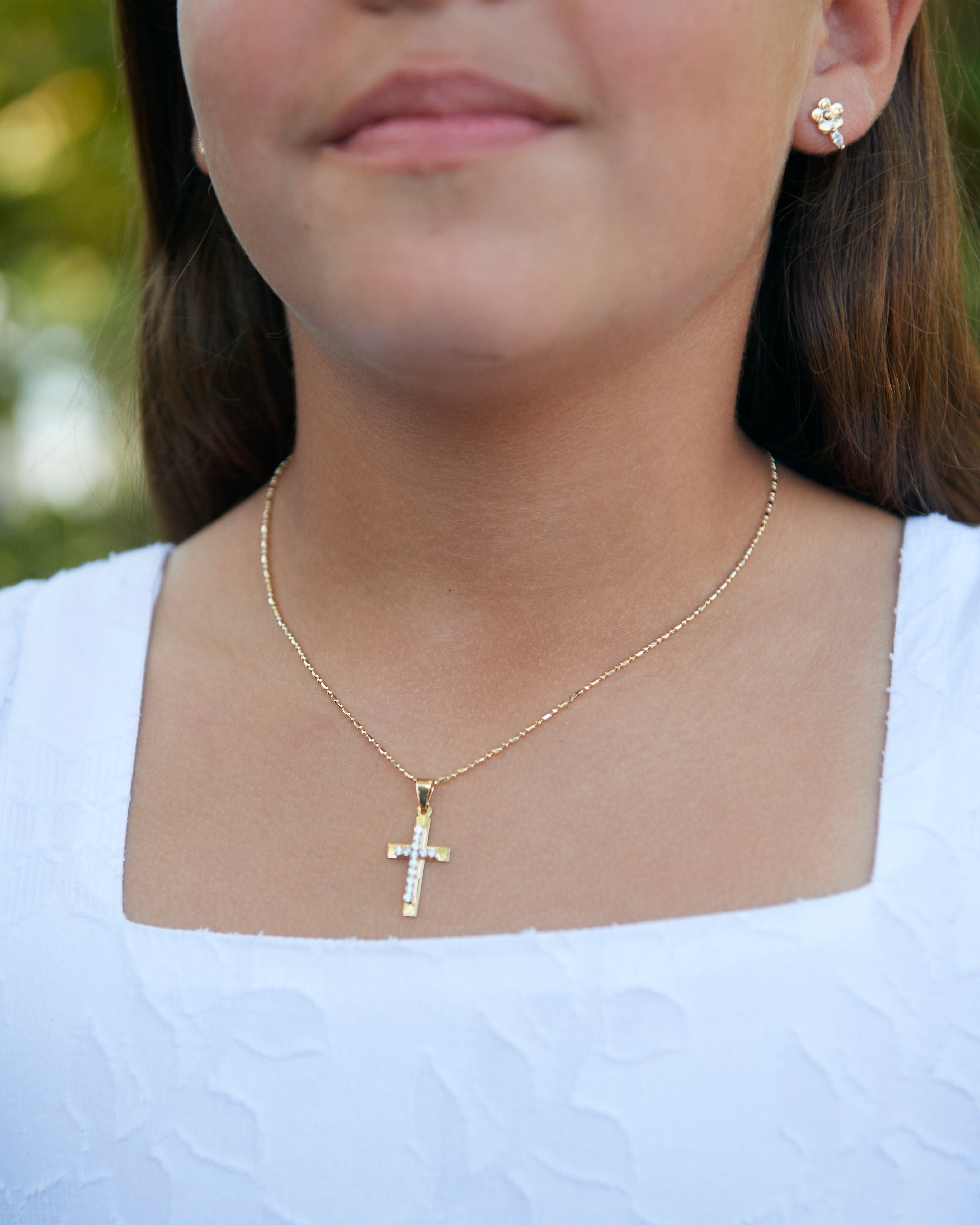 Add a touch of sparkle and meaning with our Simone CZ Cross Necklace. Featuring a delicate cross pendant adorned with shimmering cubic zirconia, this piece is a graceful expression of faith and style.