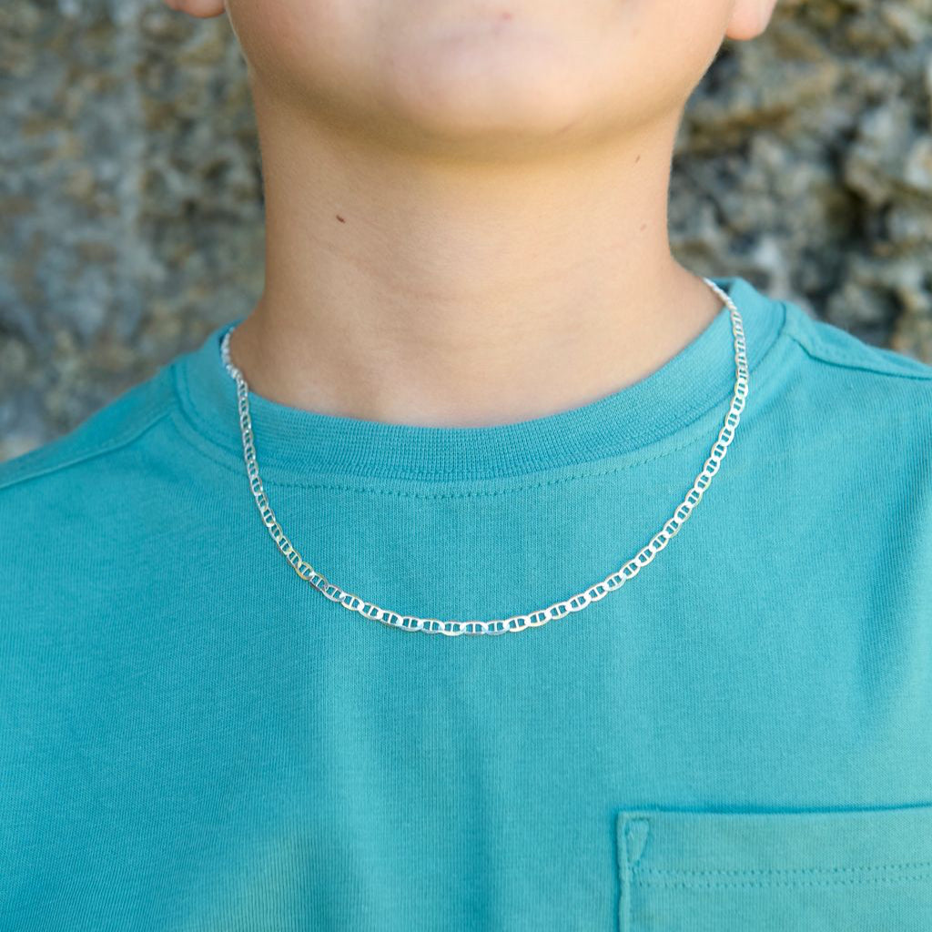 Our Soren Sterling Silver Mariner Necklace is available in both 3mm and 4mm widths — offers a bold yet timeless look designed to grow with your child's evolving style and confidence.