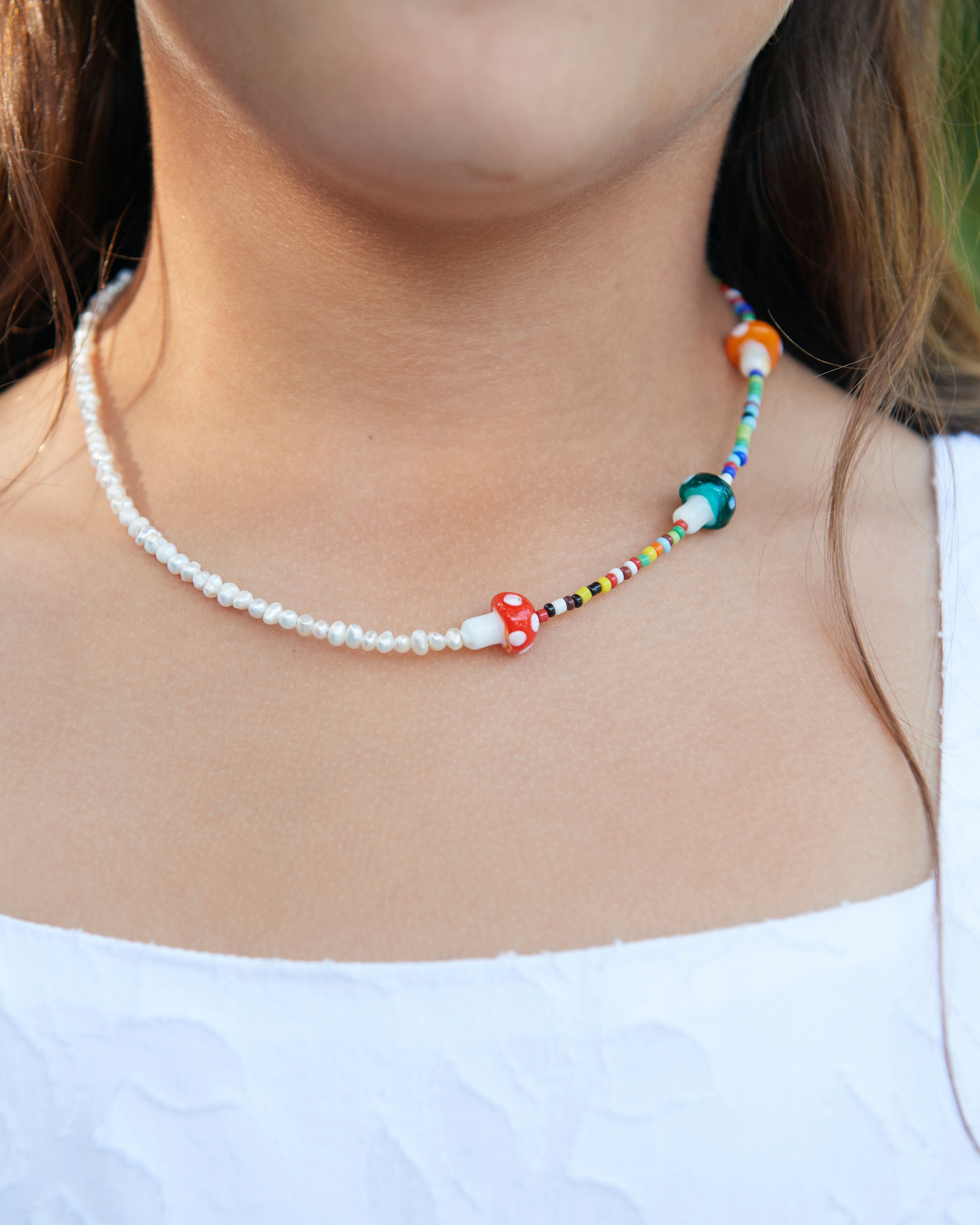 Includes a mushroom charm, freshwater pearl accents, and a mix of colorful beads