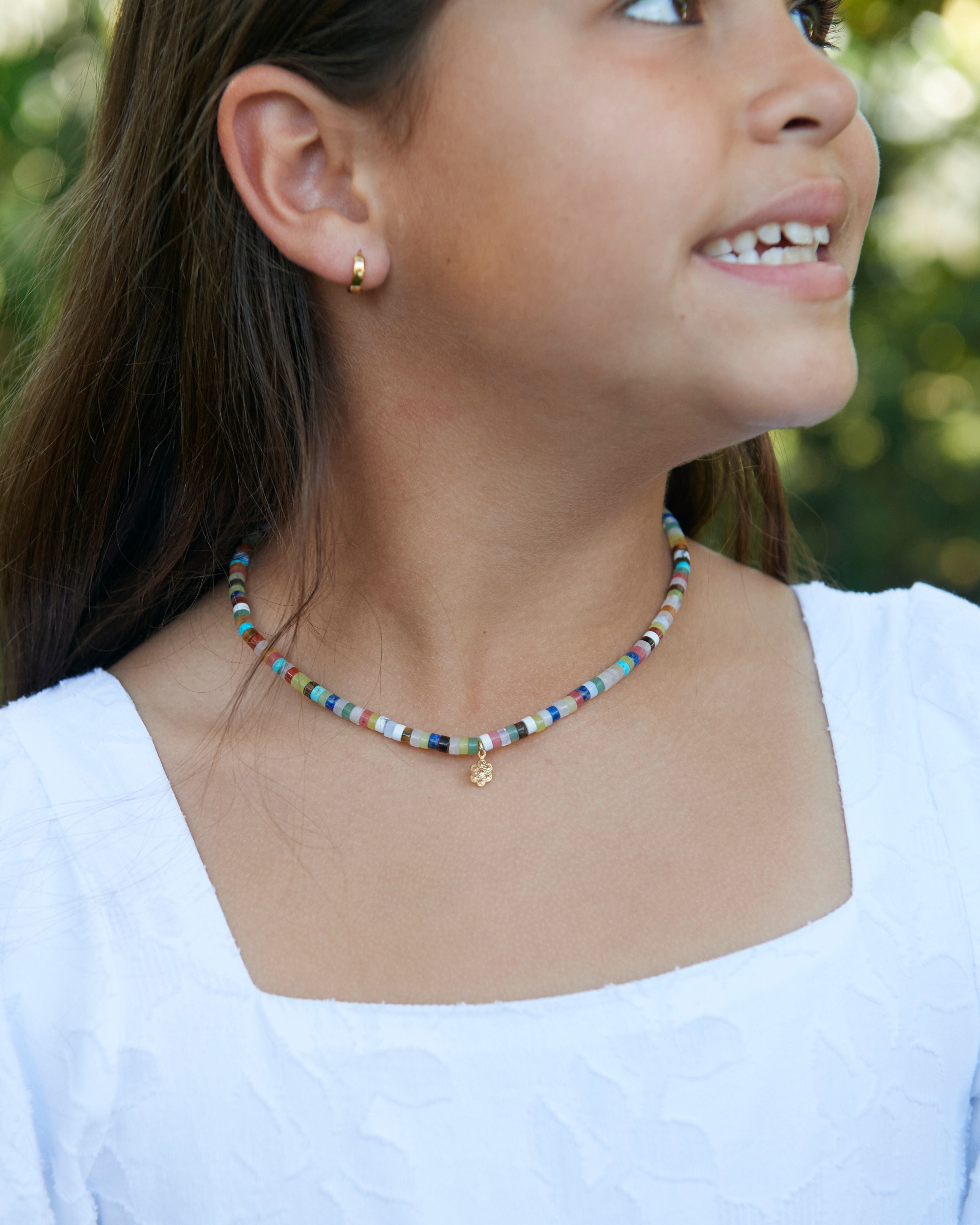 Let your little one's personality shine with our Tula Flower Necklace for girls. This enchanting necklace combines the natural beauty of mixed gemstones with a delightful flower charm. It's a whimsical accessory that adds a touch of magic to any outfit.