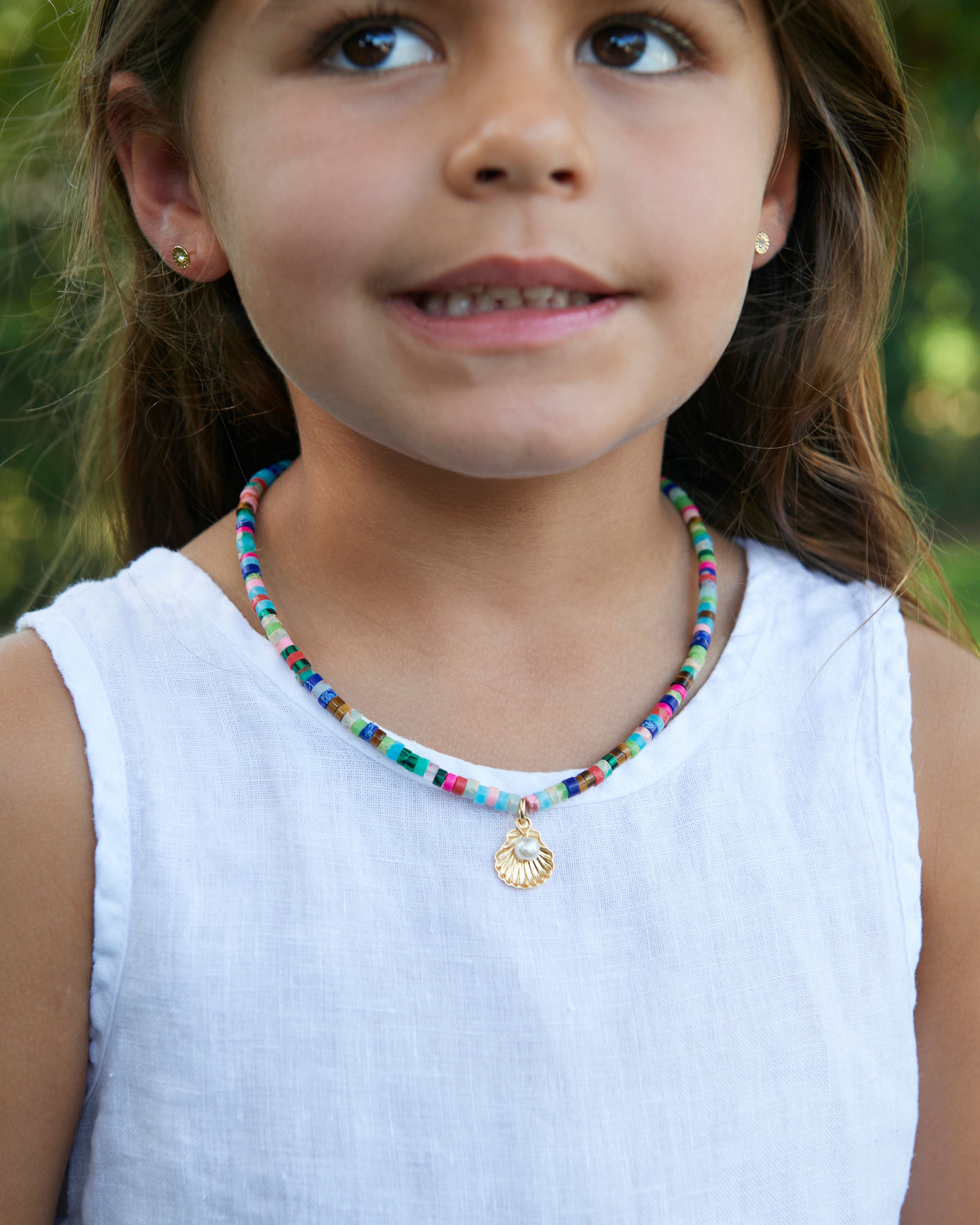 Bring beachy vibes wherever you go with our Zora Seashell Necklace for girls. Featuring a shiny shell charm and a rainbow of cheerful beads, this necklace captures the magic of sunny days, sandy toes, and endless imagination.